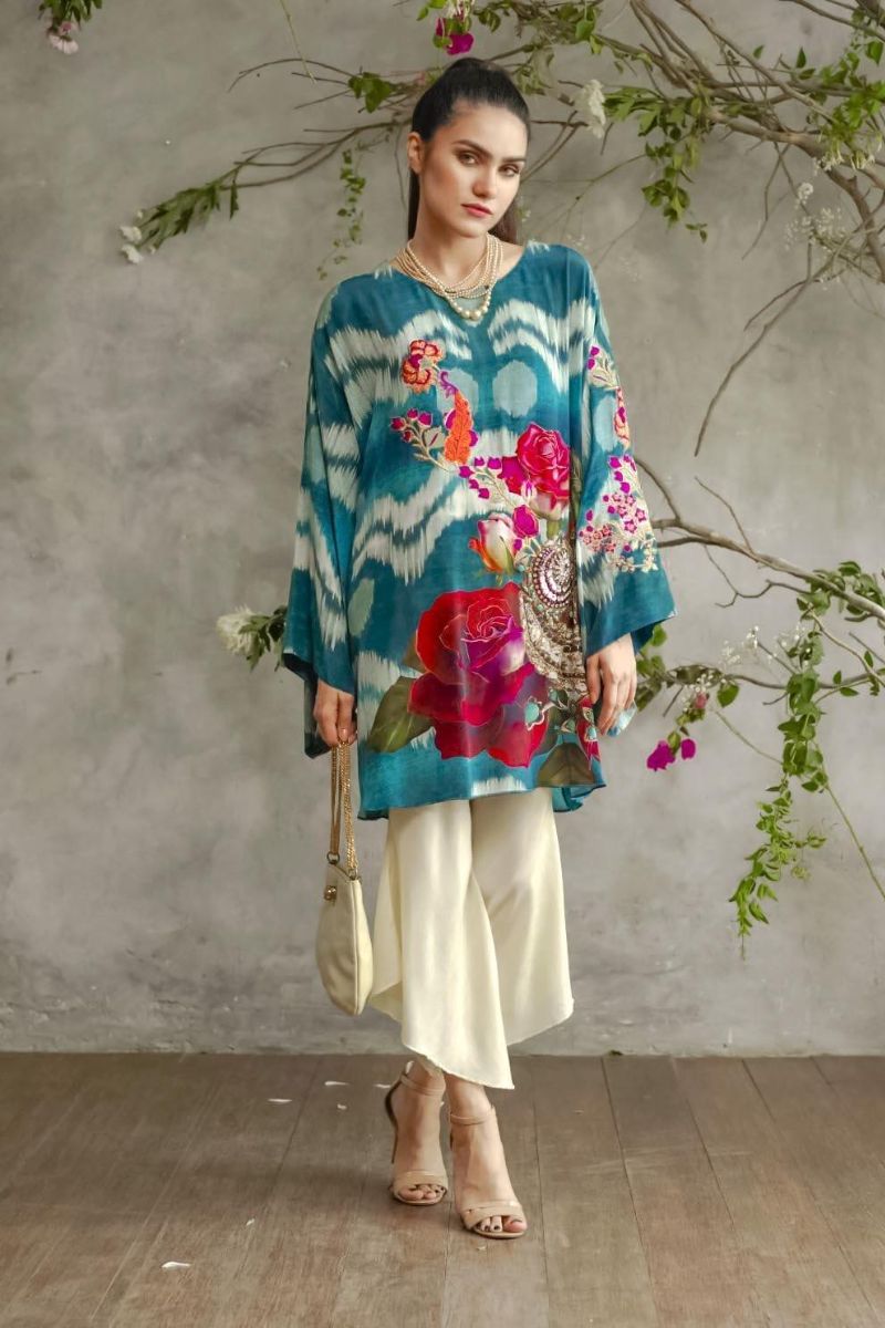 Pure silk tunic with original in-house prints and hand-worked embroidery.