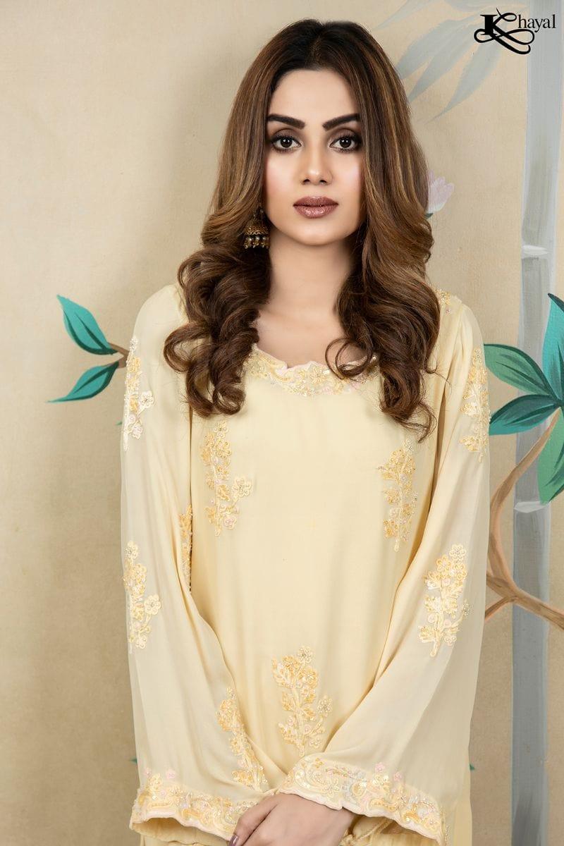 Laiba Khurram in Maria Osama Khan - Marigold Muse - YELLOW MUSTARD - RAWSILK & Organza - 3 Piece