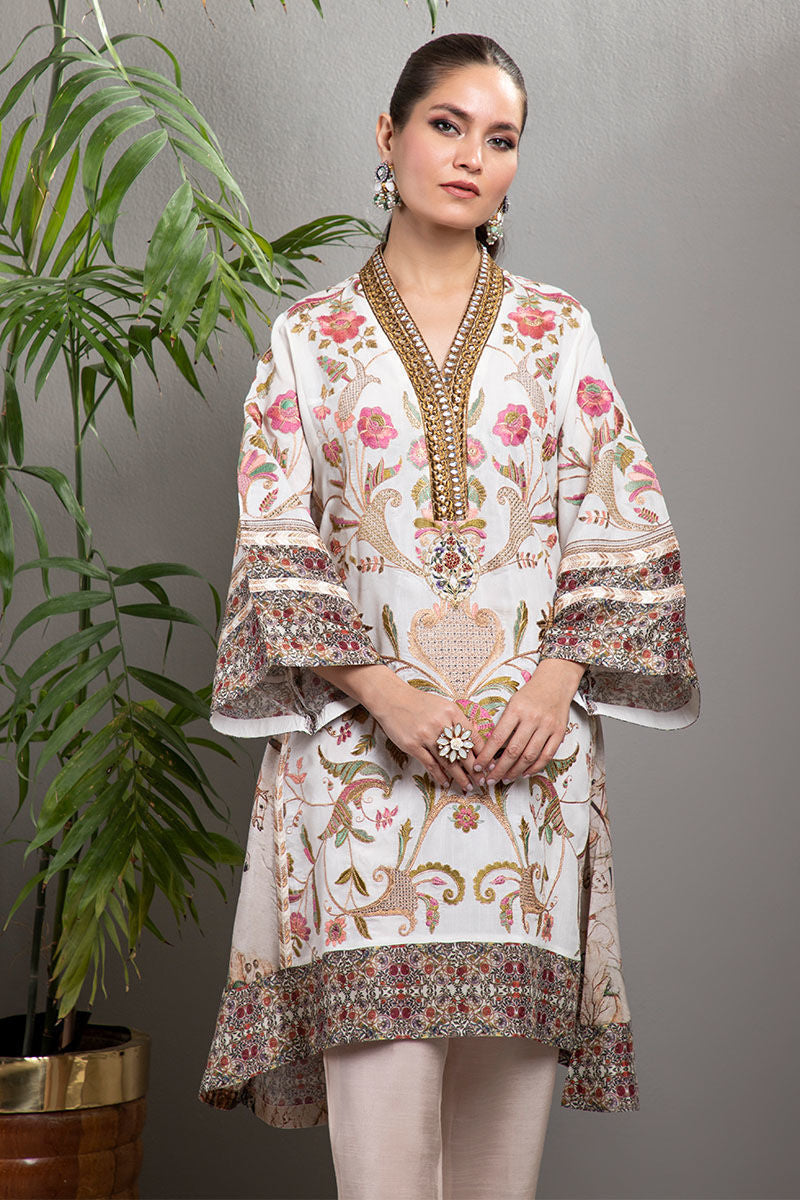 A-line kalidaar shirt with antique kundan, zari and sequins work on the neckline. Delicate hand floral embroidery over the front and sleeves. Enhanced with printed kalis and borders. Paired with silk fabric cigarette pants.