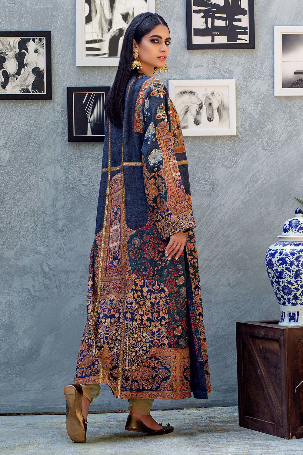 Simple yet elegant relaxed silhouette printed in the prettiest hue of dark blue texture on silk fabric features delicate floral prints enhanced with antique copper tila craft. Hand crafted Mughal inspired neckline embellished with pure resham deep maroon and green silk thread, antique tila, stones and zardozi.