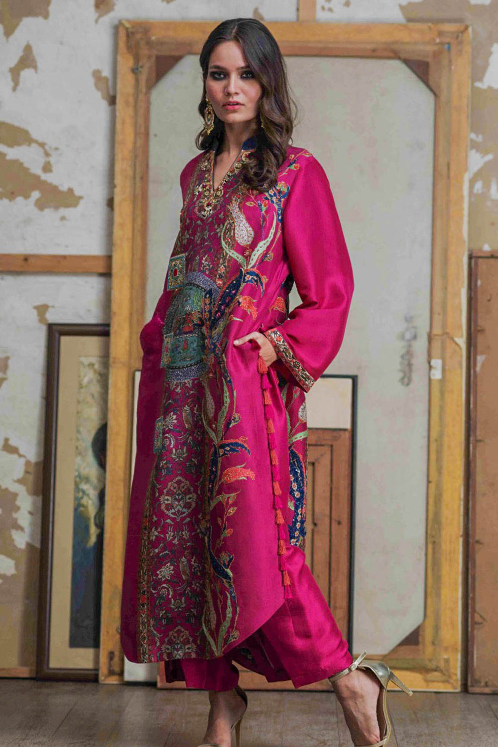 Long silk shirt with antique zardozi and beaded jewel work inspired by Royal Ottoman jewelry. It is enhanced with Gold Zari outlining with colored sequins work and Resham embroidery. Gold Zardozi sequins and Resham embellished boxes on the front and resham tassels on the side openings complete the look. Pants can be added separately.