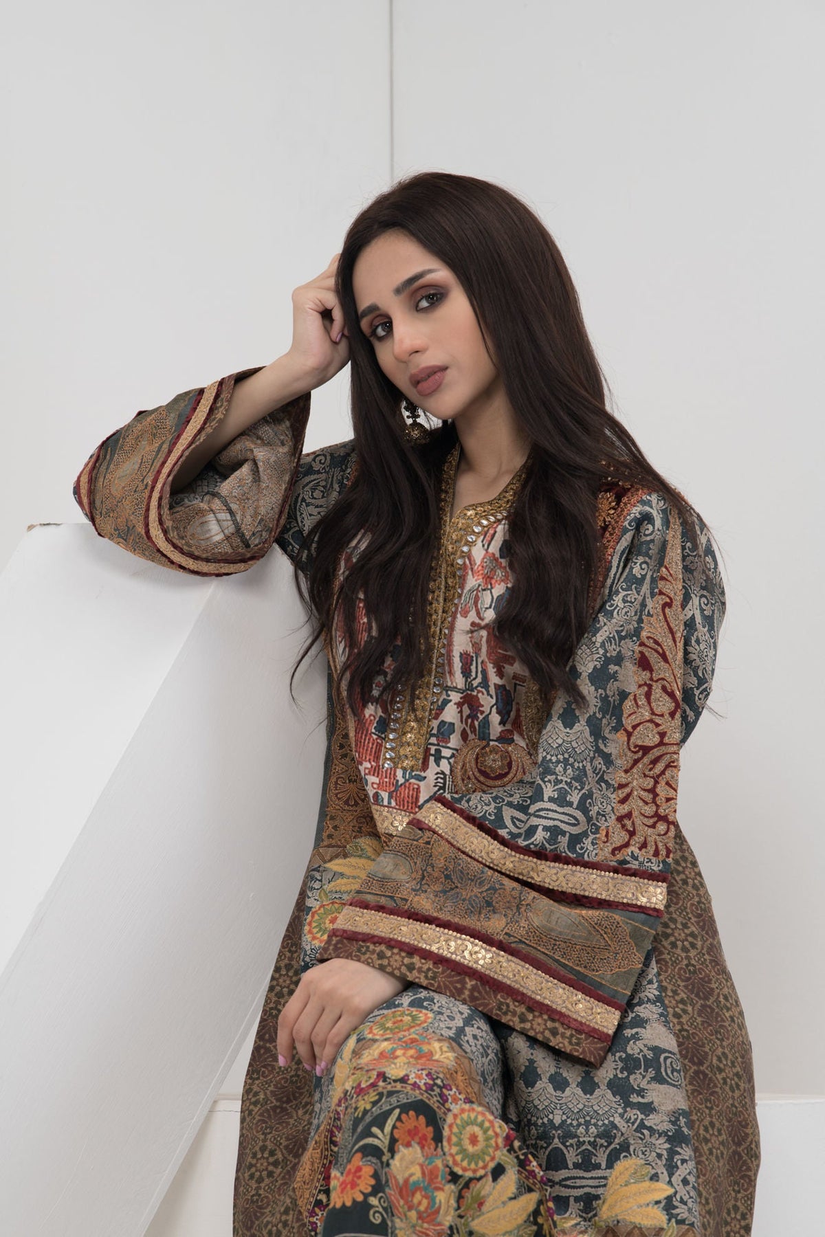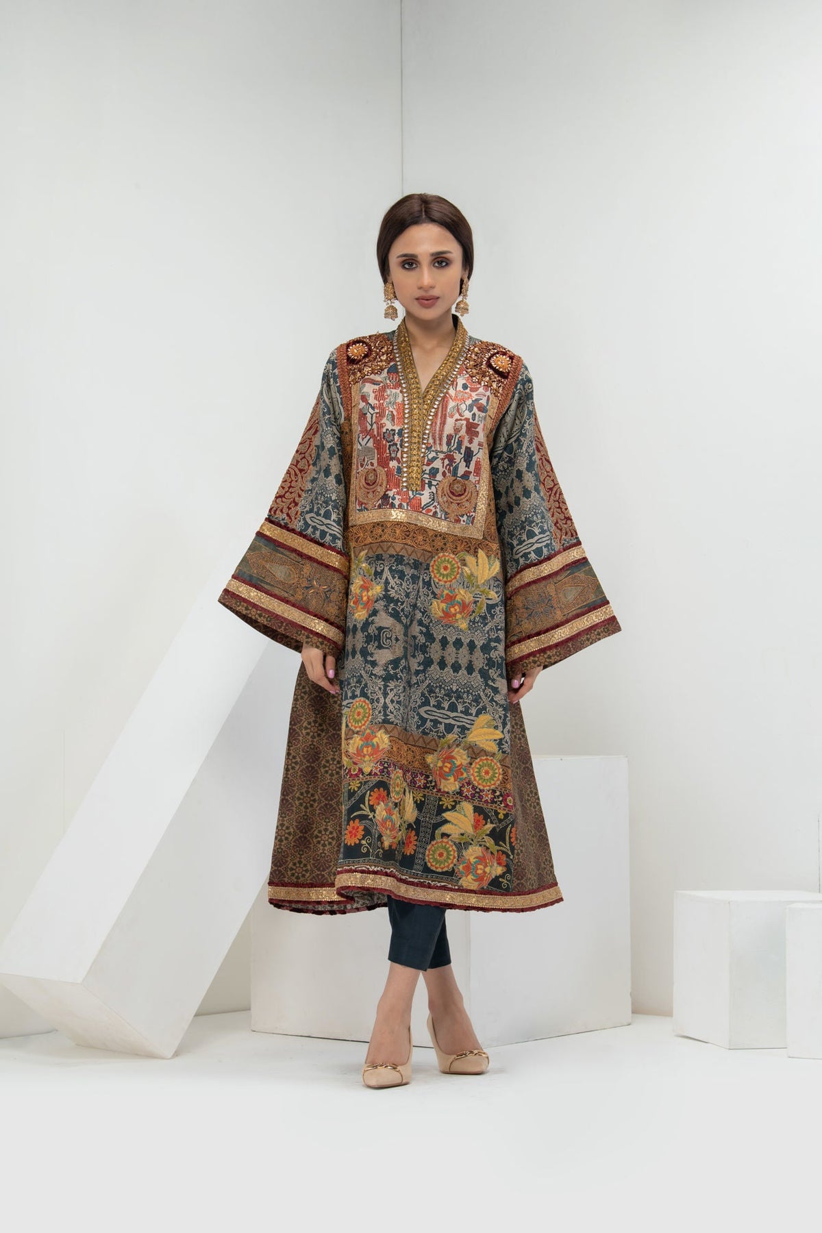 A-line kali shirt inspired by antique Ottoman carpets kundan and gold zari tilpat on the neckline kasab and bead worked border antique colored pati on velvet chakras on the shoulder intricate gold outlining on the front jewel embellished with zardozi motif on the front. Can be paired with silk pants.