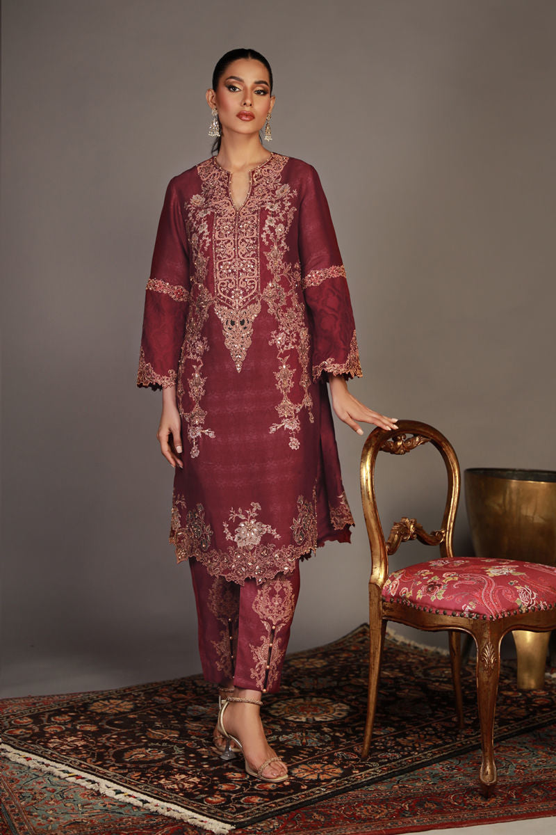 Kurta Cut in shamaeels signature print in gold tila outline, Hand touched in nakshi, dabka, sequence in gold. Enhanced by using pearls and antique moti. It is paired with a straight embroidered pants.