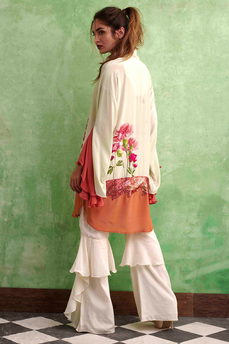 A printed one piece silk tunic with dramatic flarred sleeves and printed collar with sequins on hem and embroidered floral motif on the front. Pants can be added seperately.