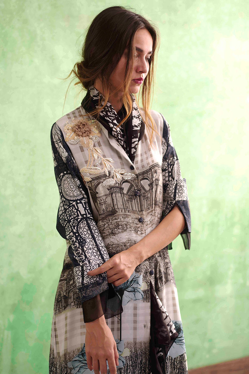 Long printed front open shirt with a curved hem line and hand embroidery bunch near the shoulder. Pants can be added seperately.