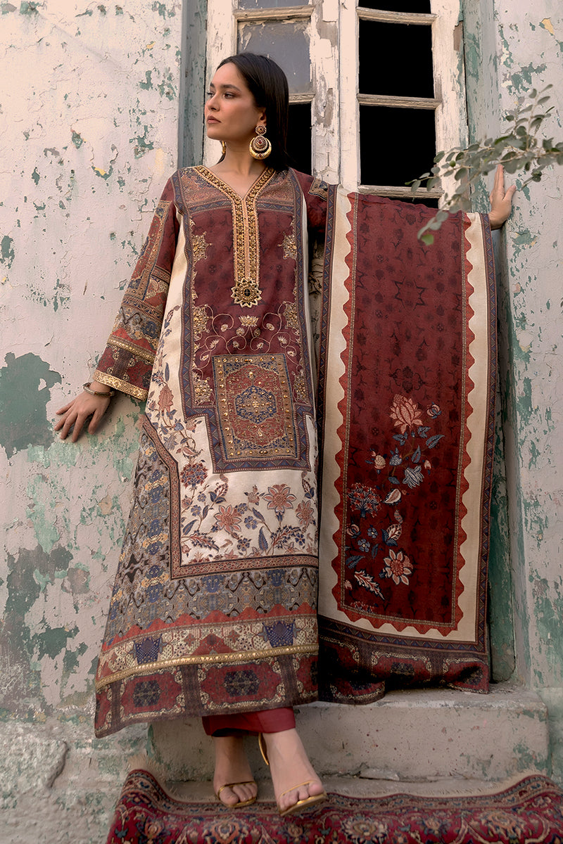 A statement silk ensemble inspired by classical artistry and heritage motifs. The silk shirt features rich, tapestry-like detailing with intricate borders and a balanced palette of warm saffron and earthy tones. Paired with fluid silk pants, the silhouette flows with effortless grace and quiet grandeur. Designed for women who appreciate depth, culture, and refined elegance, this look embodies timeless craftsmanship with a modern couture sensibility.