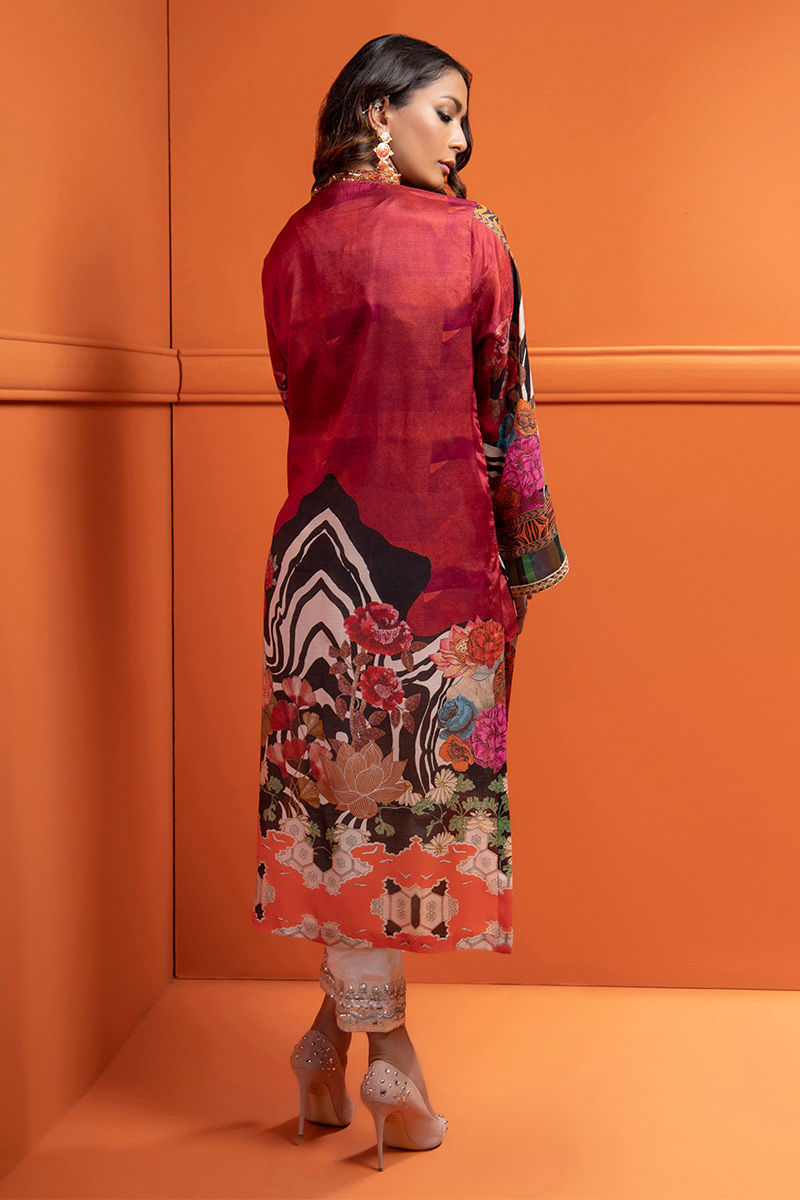 Easy breezy straight shirt with funky bold digital print printed on silk fabric tilpat galla patti and jeweled motif handcrafted with antique gold sequence, antique gold moti, maroon and gold dapka, stones and pearls and finished with handmade gold tila and sequence lace on the sleeves.