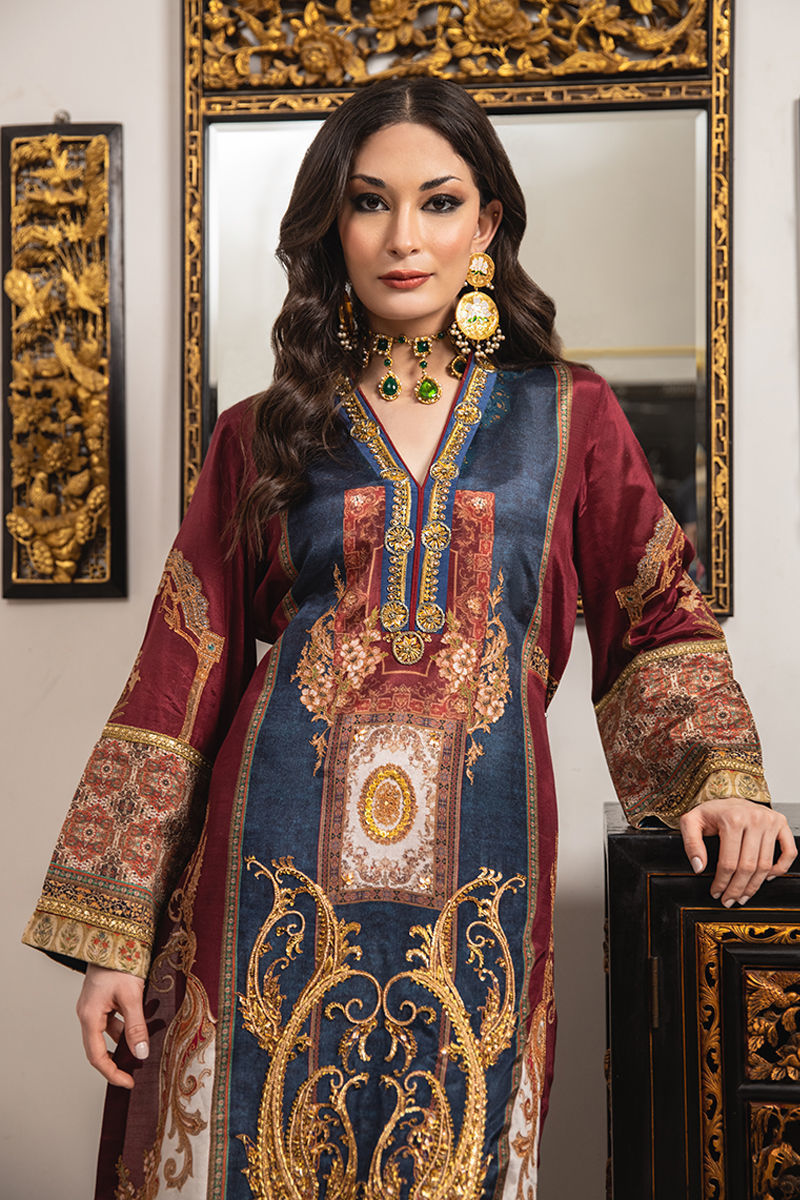 The navy-themed royal antique garment design exudes an air of timeless elegance and sophistication, drawing inspiration from the regal fashion of yesteryears. To accentuate the royal antique theme, neckline is crafted with handwork details and fully daman work with zardozi, dabka and sitara. Whether worn for a formal event, a special occasion, or a cultural celebration, this design is sure to leave a lasting impression, showcasing a perfect blend of regality, antique charm, and contemporary fashion sensibilities. Gives you a complete look when paired with matching pants.