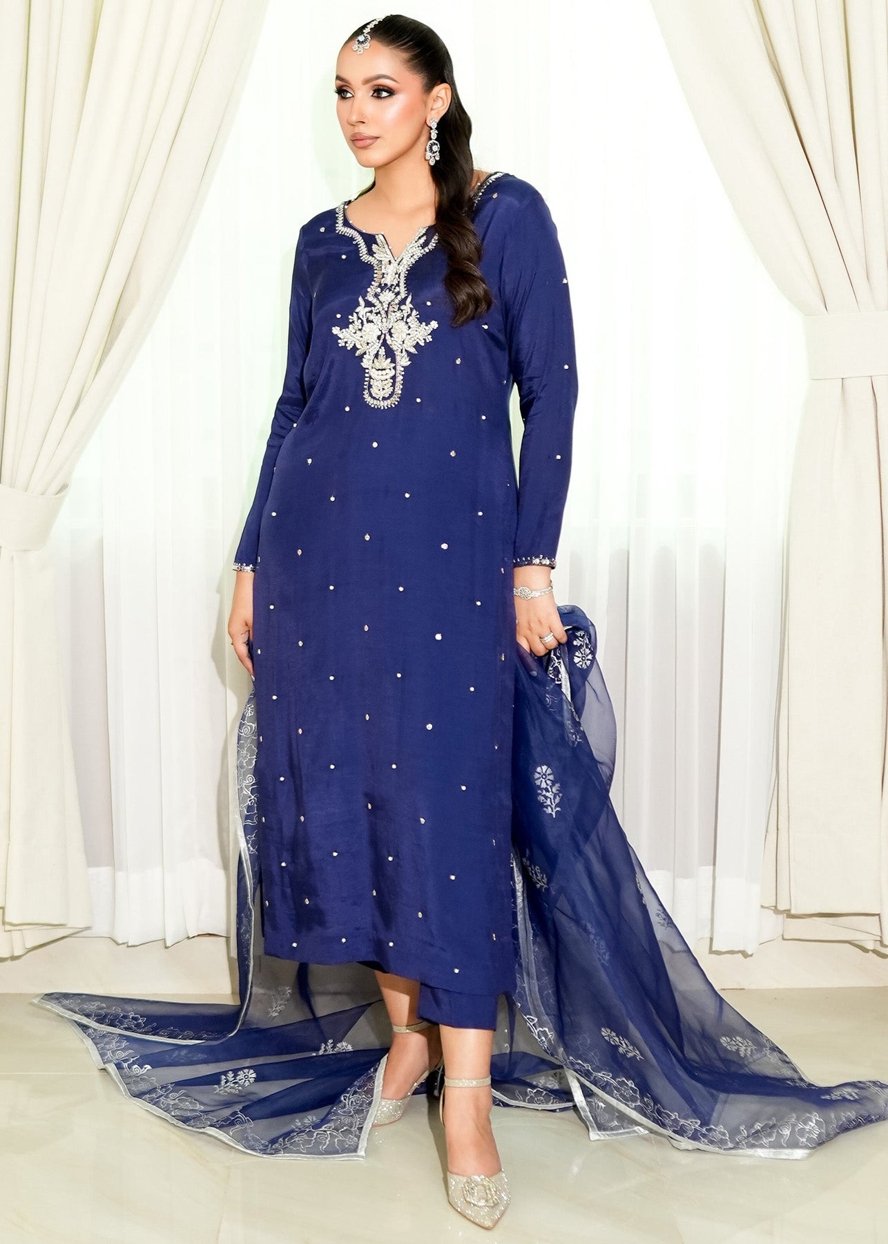 Step into refined elegance with this 3-piece luxury pret ensemble in a dreamy deep blue shade. The shirt, crafted from delicate hand work , features a beautifully designed front adorned with a blend of modern and traditional embellishments, showcasing a sophisticated fusion of styles. Paired with straight pants in premium silk, the silhouette is both graceful and contemporary. The look is completed with a soft, flowing organza dupatta, subtly enhanced with a block print borders and chatta.
