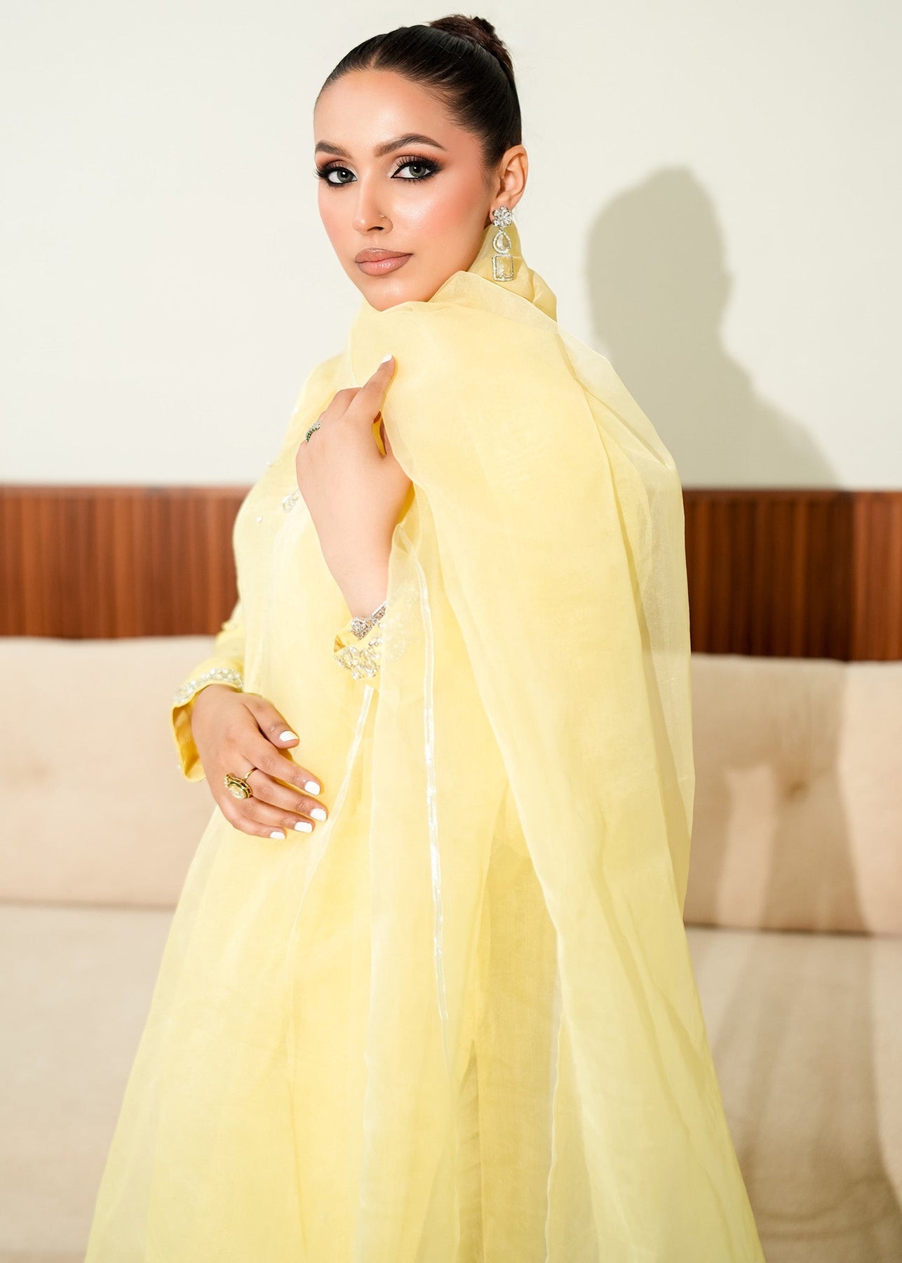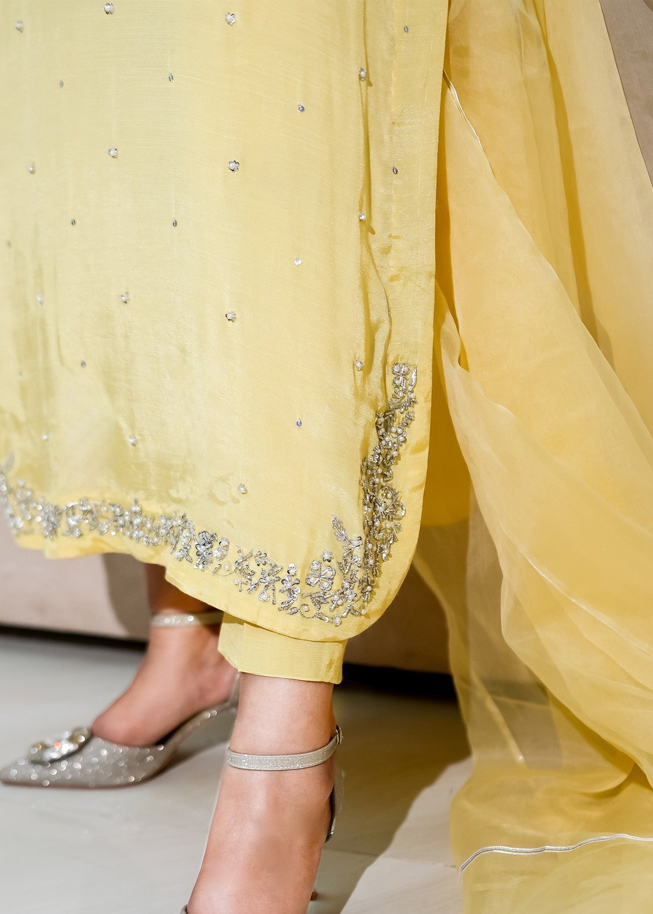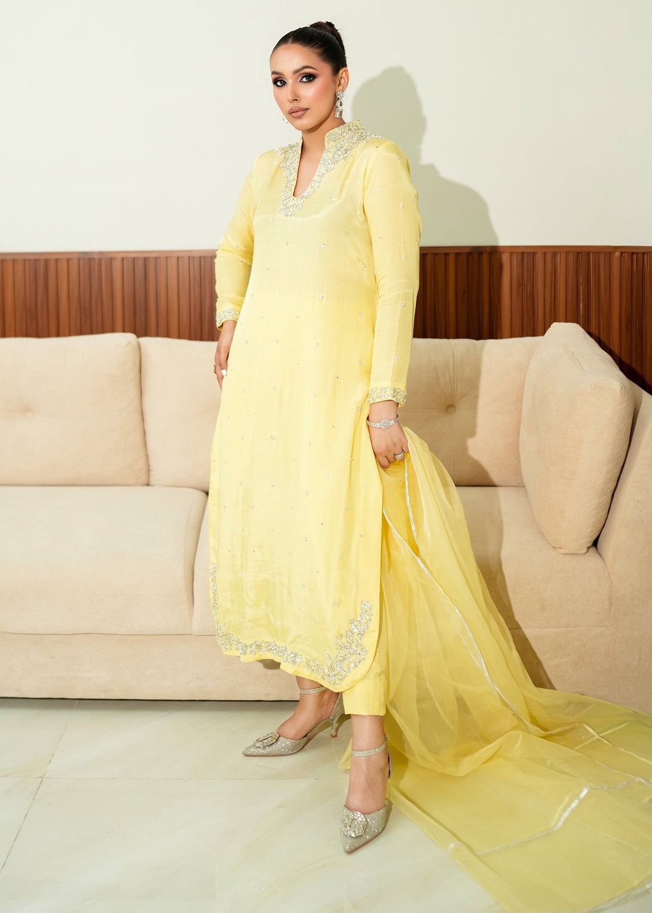 A gorgeous lemon-colored long shirt adorned with silver and ivory embellishments around the neckline and along the hem, features round daman,paired with straight pants and a flowy dupatta featuring exquisite lace detailing.