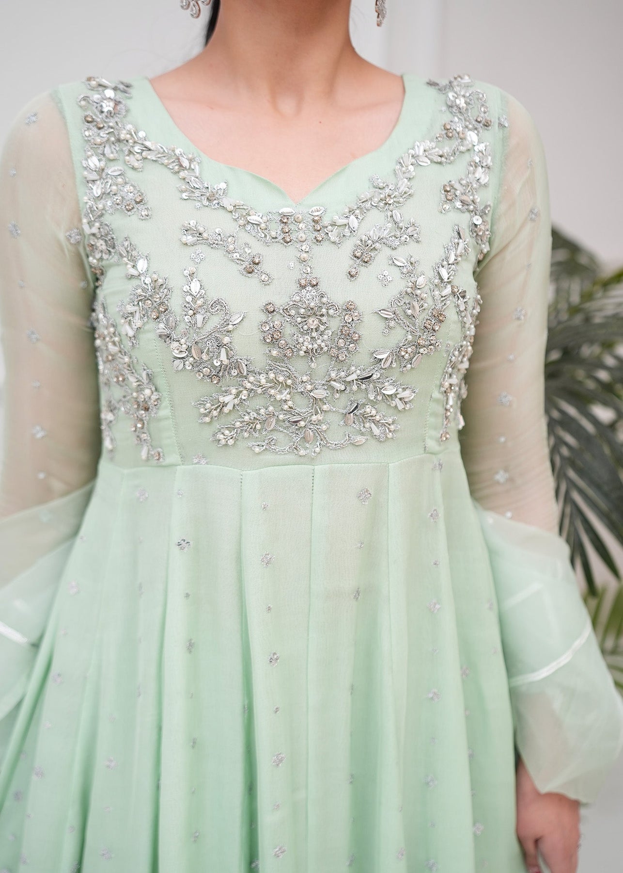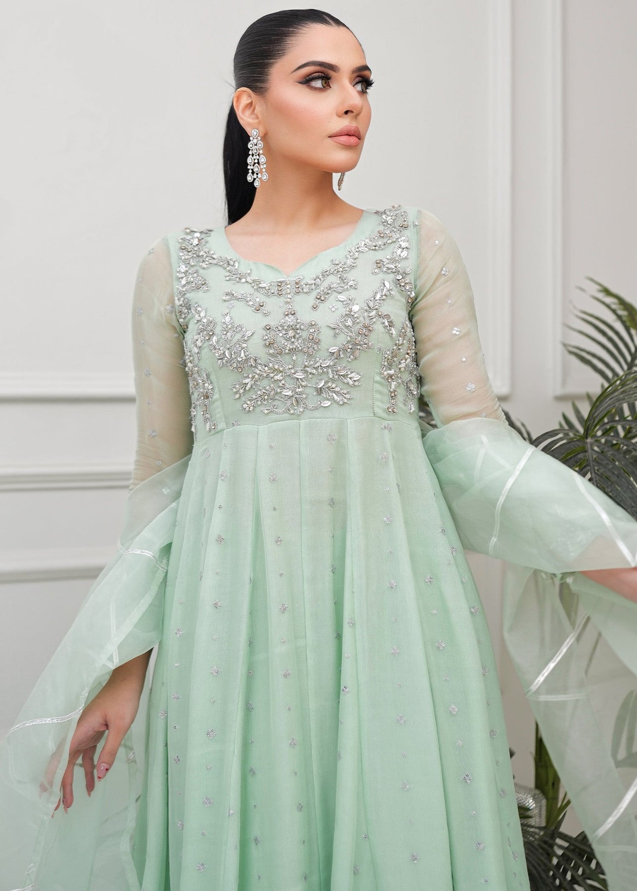 This elegant three-piece ensemble is crafted in a refreshing mint green palette, designed to embody grace, softness, and festive sophistication. The outfit features a flowy silhouette that flatters the body while allowing effortless movement, making it an ideal choice for celebratory occasions. The Peshwas is tailored with a gently flared cut, enhanced by a delicately embellished bodice that adds subtle sparkle without overpowering the look. The Lehnga adds volume and drama to the outfit, ensuring a graceful drape that moves beautifully with every step. This outfit is an excellent choice for Eid gatherings, wedding festivities, dholkis, engagement dinners, and formal celebrations.