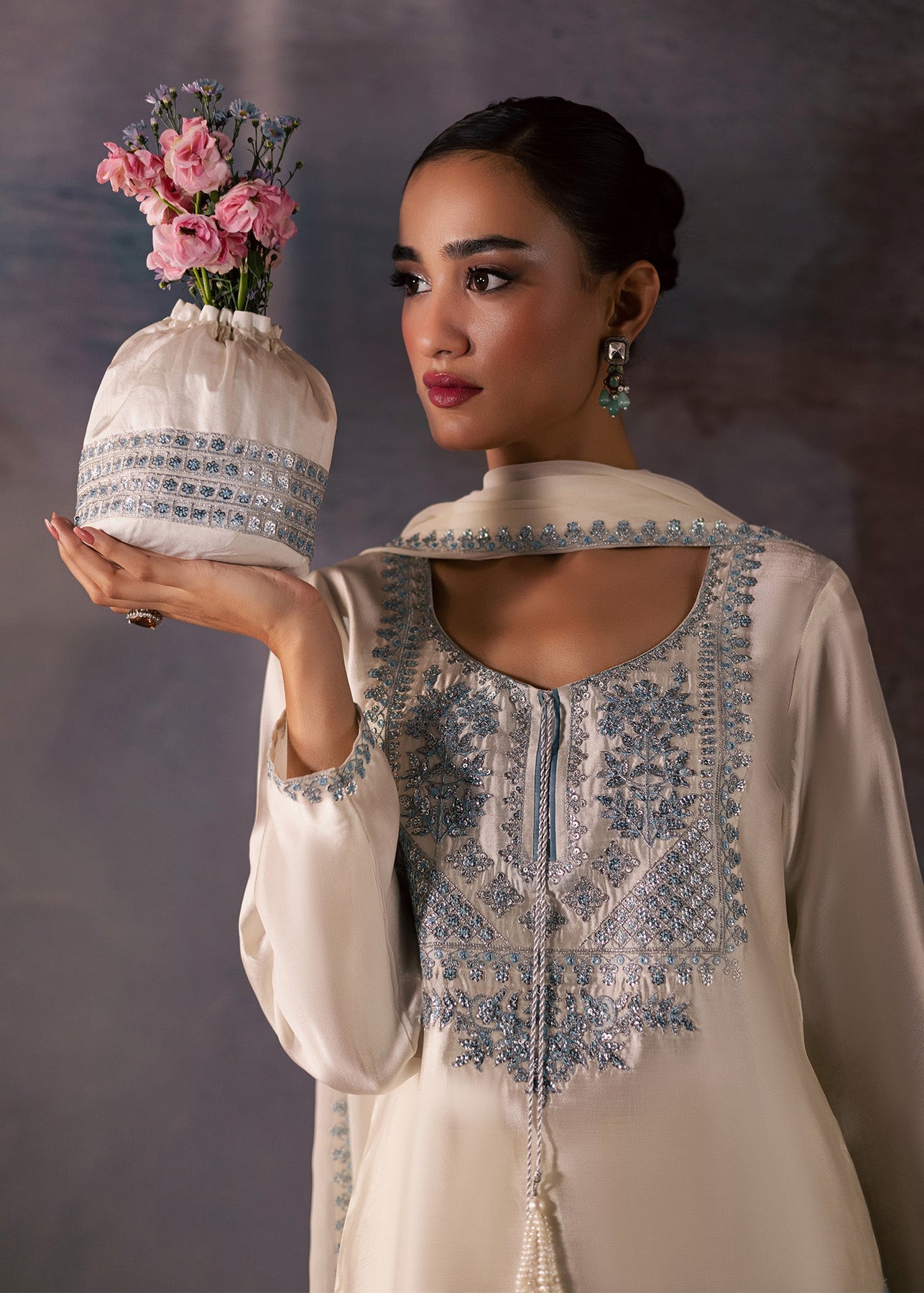 Step into effortless sophistication with this stunning ivory silk set, a vision of understated grace and timeless allure. The straight-cut kurta features a soft ivory base delicately adorned with powder-blue thread and sequin embroidery along the neckline, sleeves, and hem. The intricate craftsmanship adds a touch of regal detail without overpowering its serene simplicity. The neckline’s elegant design is enhanced with subtle tassel ties, blending tradition with modern femininity. Paired with matching silk trousers, finely finished with coordinating embroidered borders, the outfit exudes balance and poise. The light, flowy dupatta in sheer silk chiffon completes the look — edged with fine blue embellishment that mirrors the kurta’s embroidery, creating perfect harmony in design and color.