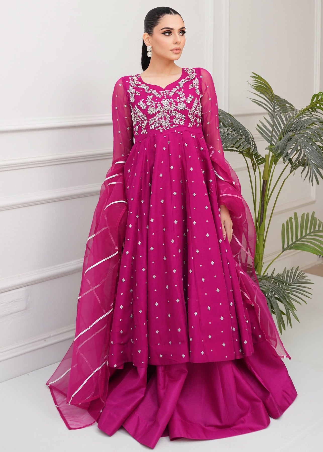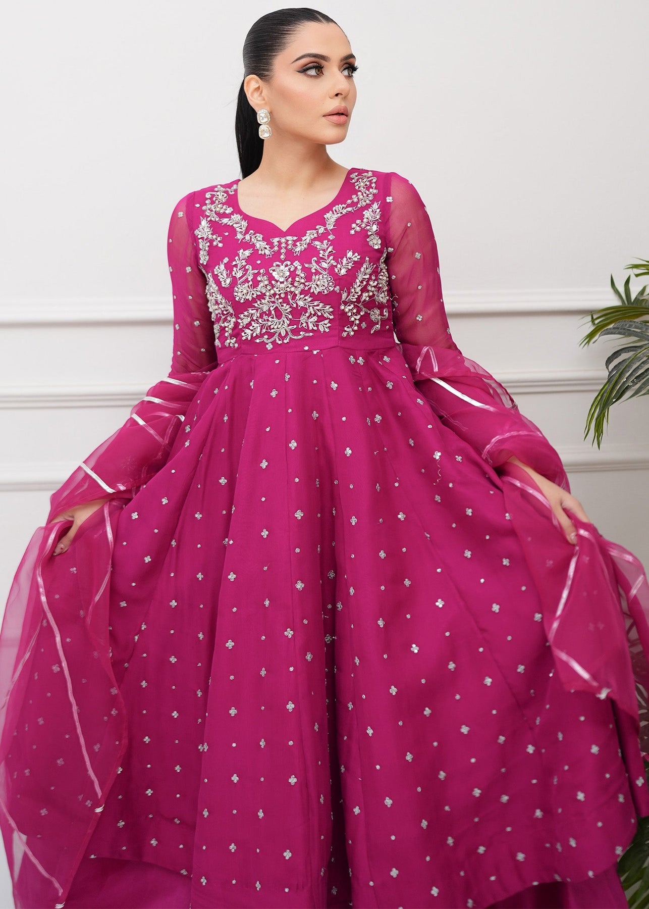 This striking three-piece ensemble is crafted in a bold fuchsia pink, designed for those who love to make a confident and elegant festive statement. Rich in color yet refined in execution, the outfit features a flowing, flared silhouette that offers drama, movement, and timeless femininity. The embellishment draws attention upward, enhancing the neckline and upper silhouette before flowing effortlessly into the voluminous fall of the outfit. Its translucent drape adds movement and elegance, framing the outfit beautifully and enhancing its festive appeal.