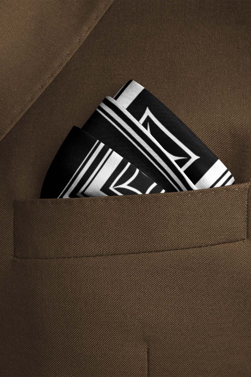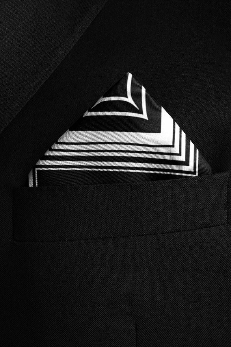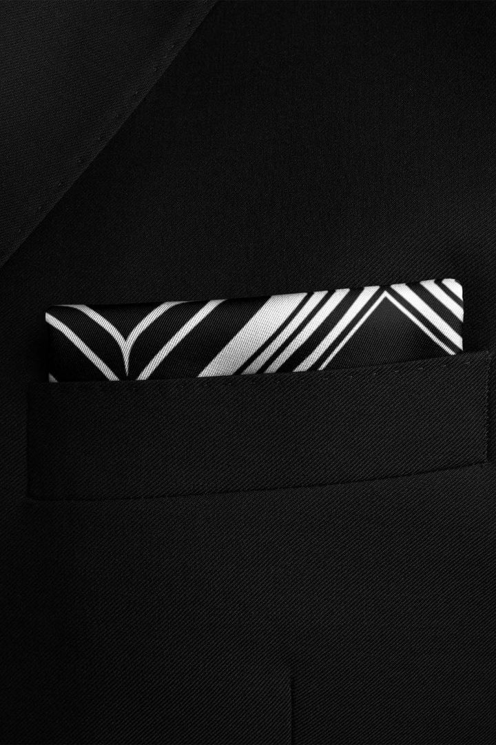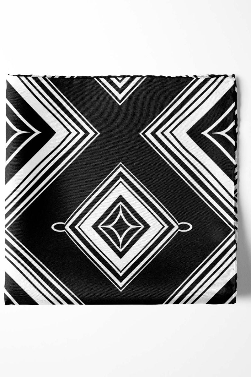 Sophisticated black and white pocket square featuring bold geometric pattern of nested diamonds, exudes modern elegance and contemporary flair, perfect for men's suits.