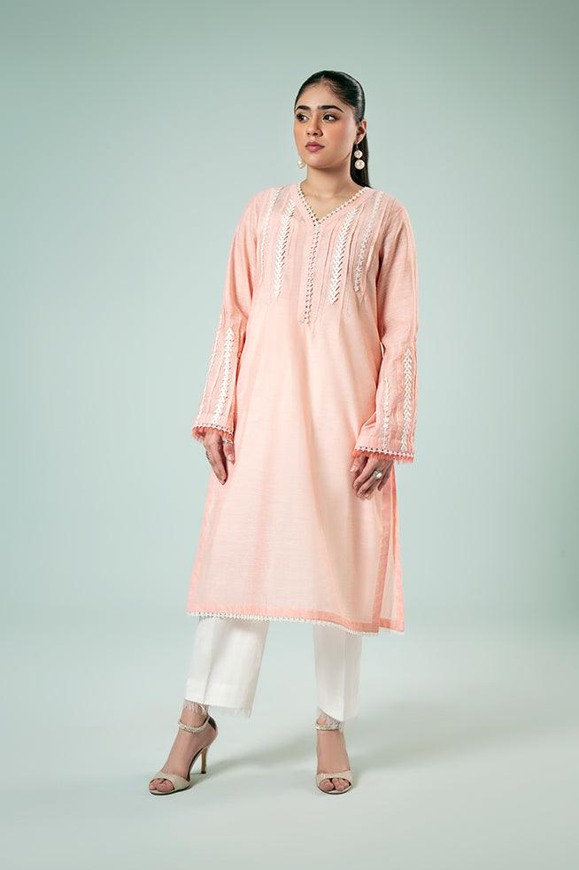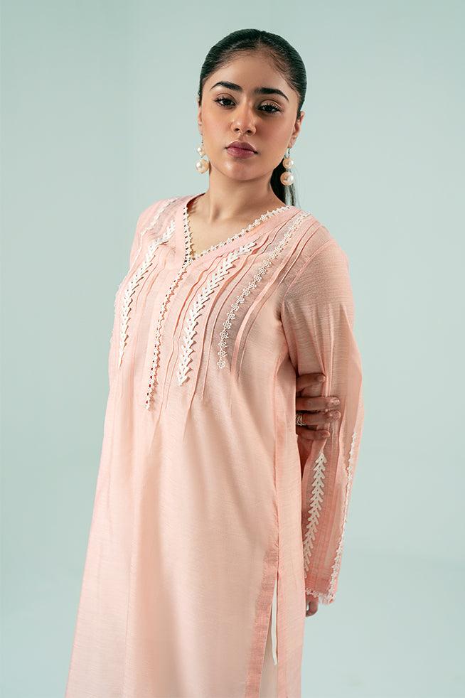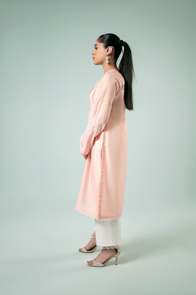 A loose-fit paper silk kurta in a peachy pink tone, adorned with intricate lace and pintuck details on the neckline and sleeves.