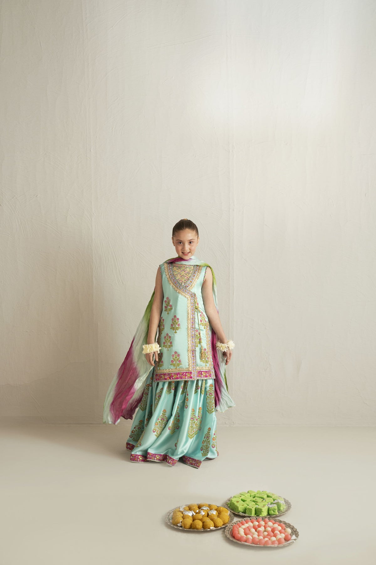 Shehrnaz - Silk Ferozi Block Angrakha & Gharara Set For Girl - Ferozi Blue