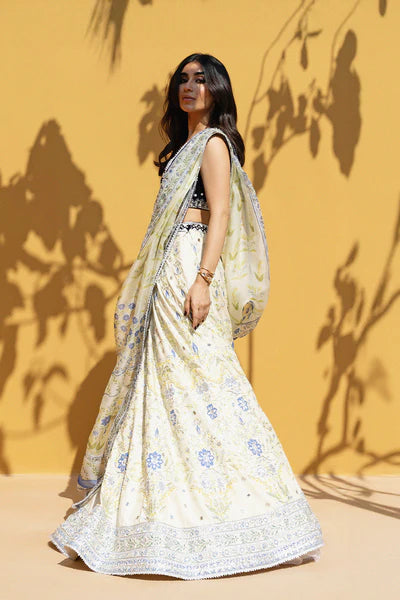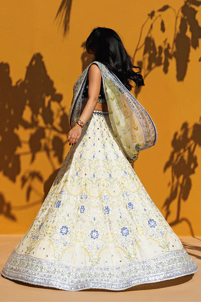 A striking ensemble pairs a midnight blue velvet choli with intricate zardoze and gota embellishment. The plush choli is balanced by the radiance of a pale cream hued lehnga, detailed with shimmering silver zardoze and gota embroidery and touches of periwinkle and lime florals that create cascading botanical latticework that finishes in a richly worked border. A pre draped organza dupatta completes the look, elevated with gota work and delicate edging, and a jeweled peacock brooch adds a refined touch to the waistband of the lehnga for a polished silhouette.Design may vary slightly from the display images.A variation in size of +/- 2 inches is considered within an acceptable tolerance.