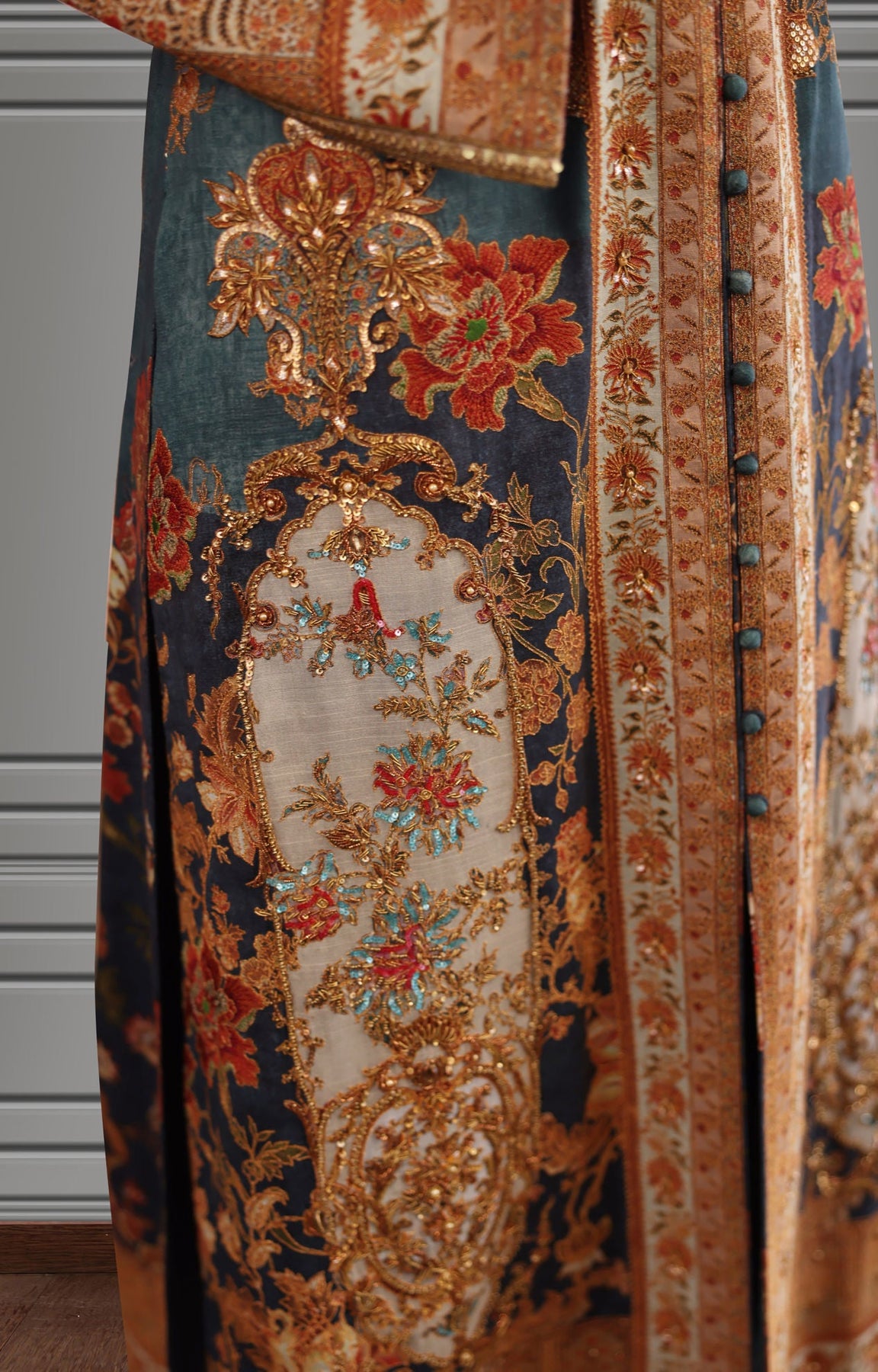 Long straight silhouette intricate floral digital print on silk fabric beautifully handcrafted galla with detailed zardozi work print enhanced with reshma thread, zardozi work and tila thread embroidery. This luxurious outfit is paired with banarsi pants. You can order through website or call or have an appointment with Shamaeel to customize colors of your choice.