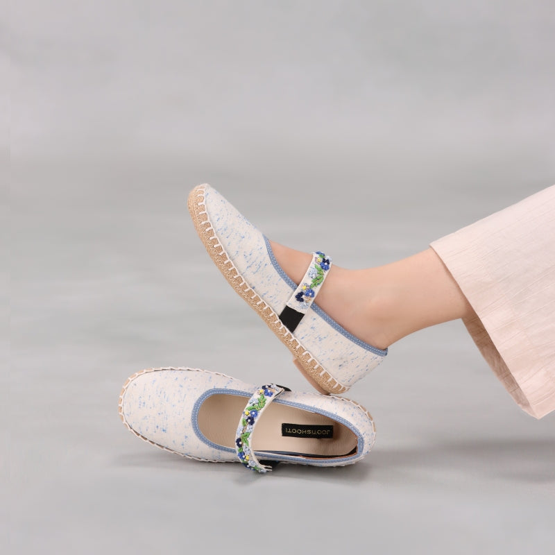 Dive into carefree days with these charming espadrilles inspired loafers that echo the vivid beauty of azure coastal waters. With playful splashes of oceanic blue and a decorative floral strap, they’re an ideal choice for sunny afternoons or leisurely seaside walks. Pair them with sundresses, denim shorts, or airy culottes for endless summer style.