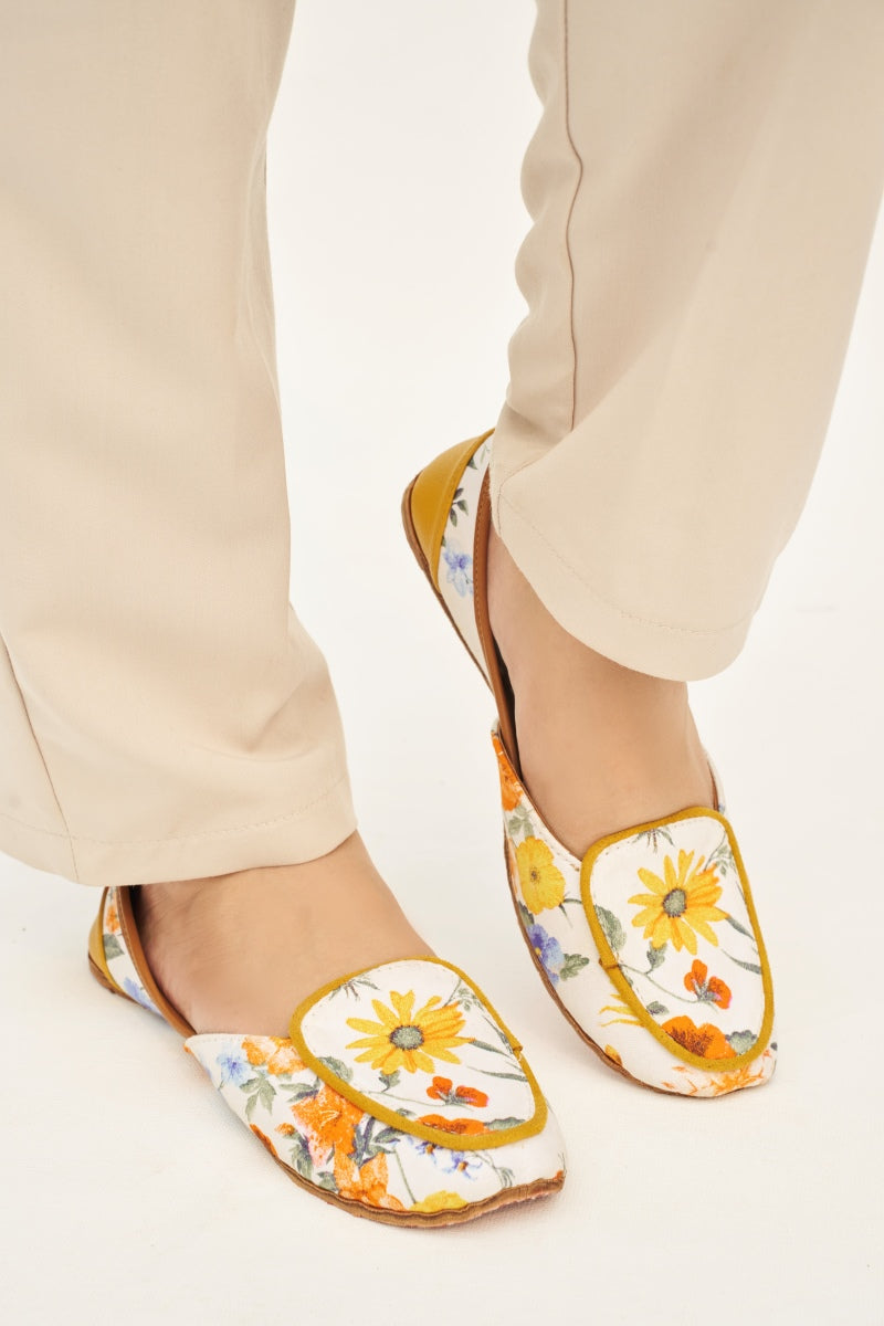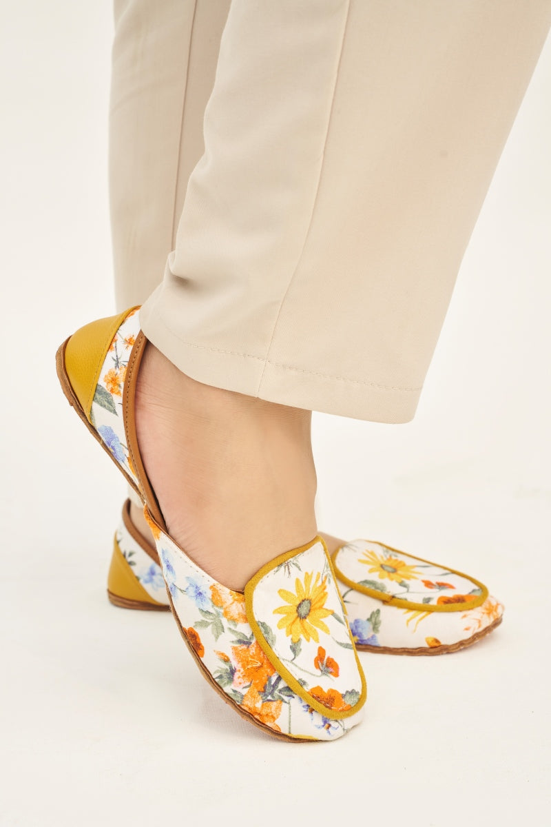 Step into elegance and comfort with our Floral Embroidered Slip-On Khussa Flats. These beautifully crafted shoes feature a vibrant floral design with yellow sunflowers and orange blossoms, adding a touch of nature-inspired charm to your wardrobe. The soft, cushioned insole ensures all-day comfort, while the durable outer leather sole provides excellent grip and stability. Perfect for casual outings or adding a pop of color to your everyday look, these slip-ons are a must-have addition to your footwear collection. Available in various sizes to ensure the perfect fit.