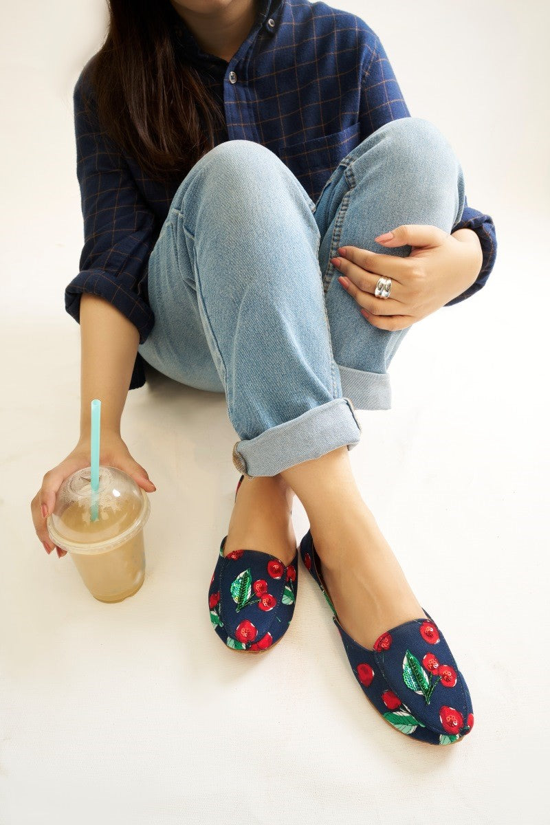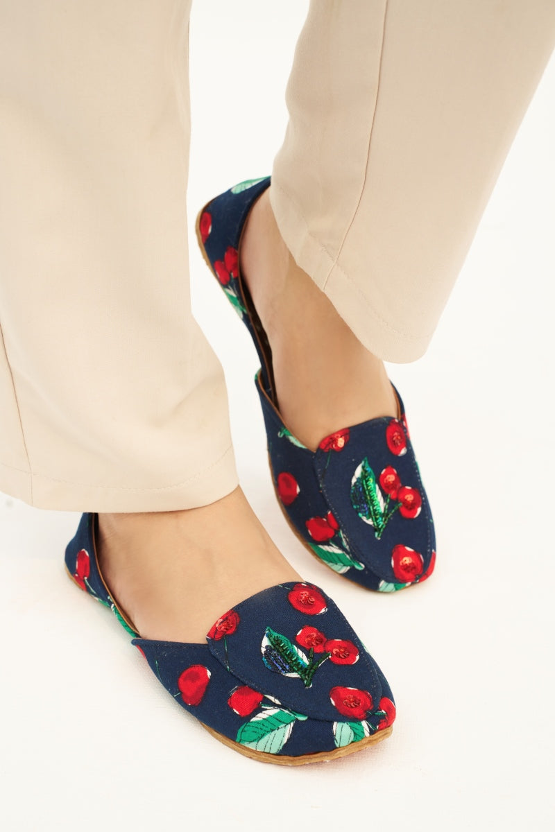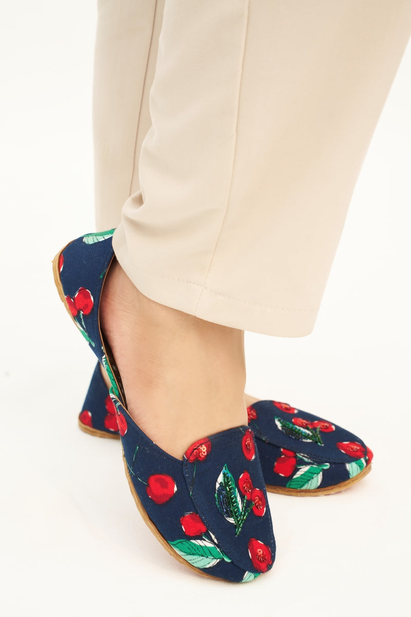 Step into comfort and style with these beautifully crafted blue khussa loafers, adorned with a vibrant cherry and leaf pattern. Perfect for casual outings or adding a pop of color to your everyday wardrobe, these loafers feature a soft, cushioned insole for all-day comfort. The detailed embroidery on the fabric adds a touch of elegance, making these shoes not only a practical choice but also a fashionable statement. Whether paired with jeans, skirts, or dresses, these loafers are sure to become a favorite in your footwear collection.