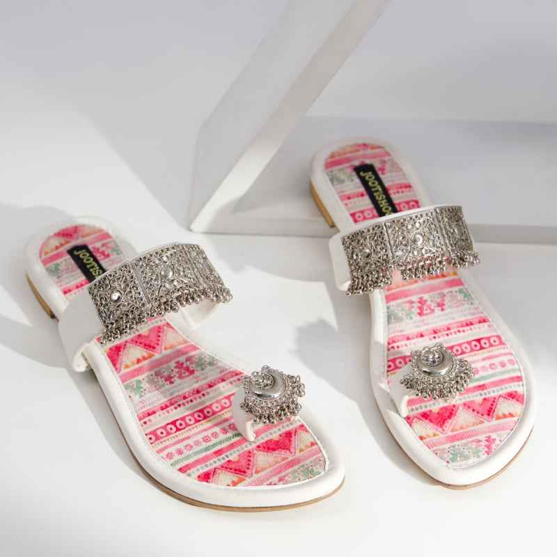 This bright-white faux-leather sandal is detailed with handcrafted silver-tone filigree on the vamp and toe ring, contrasted by a printed-velvet insole in vibrant pink-and-peach geometric stripes inspired by heritage motifs. Because each print and metal ornament is applied by hand, you’ll notice charming micro-variations that make every pair uniquely yours. Style these with pastel organza pants and oxidized-silver jewelry for a light, modern look, or let the geometric insole peek out beneath a monochrome kurta for subtle evening intrigue. To preserve their crisp appearance, gently blot the leather straps with a damp cloth, dust the filigree details with a soft, dry cloth, and store in a dust bag in a cool, dry place.