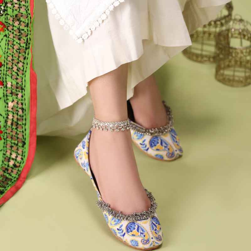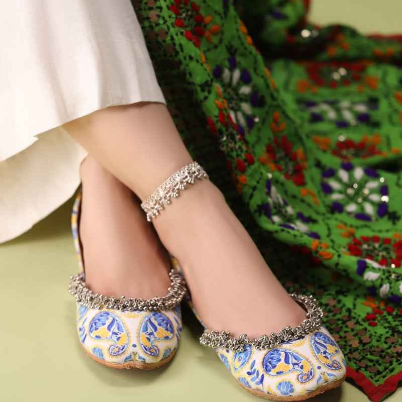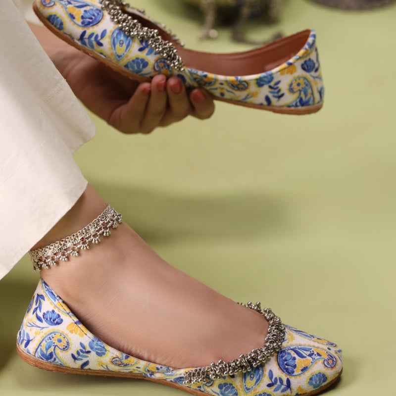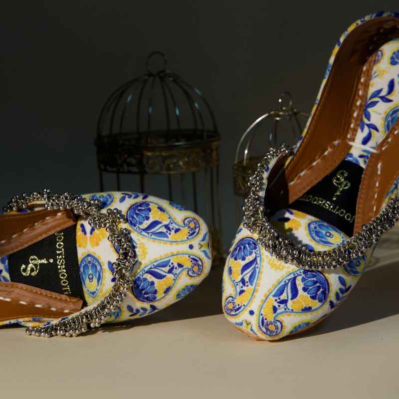 Our Sunlit Paisley khussa features bold cobalt-blue paisley and floral motifs digitally printed on velvet, drawing inspiration from traditional block-printing techniques and is framed by a delicate metallic-bead fringe that catches the light with every step. As each pair is assembled entirely by hand, slight variations in print intensity and bead placement make yours truly one-of-a-kind. Style them with crisp white linen trousers and silver anklets for a fresh daytime look, or let the vibrant palette pop against a charcoal kurta for evening elegance. To keep them looking their best, gently spot-clean with a damp cloth and store in a cool, dry place away from direct sunlight.