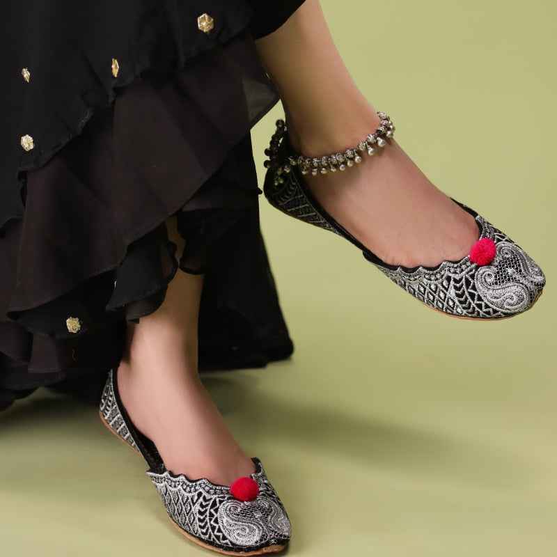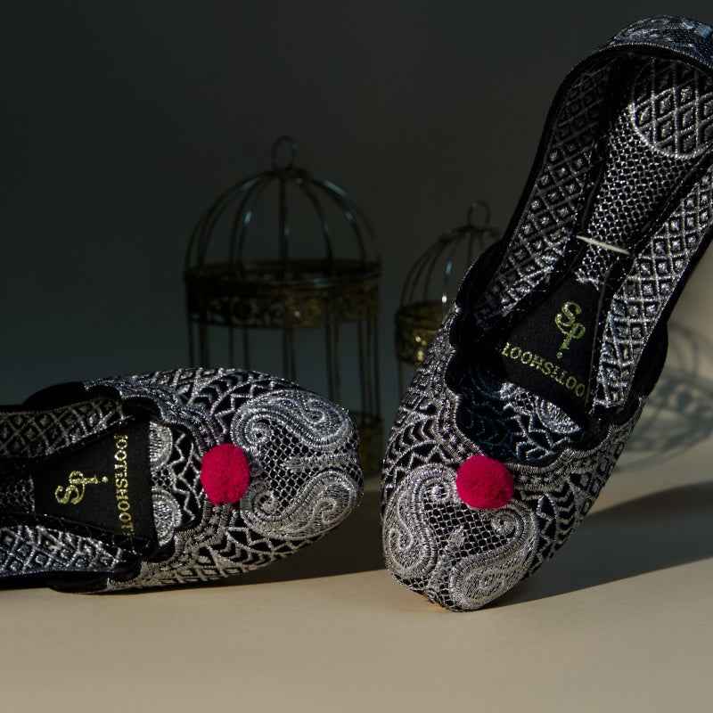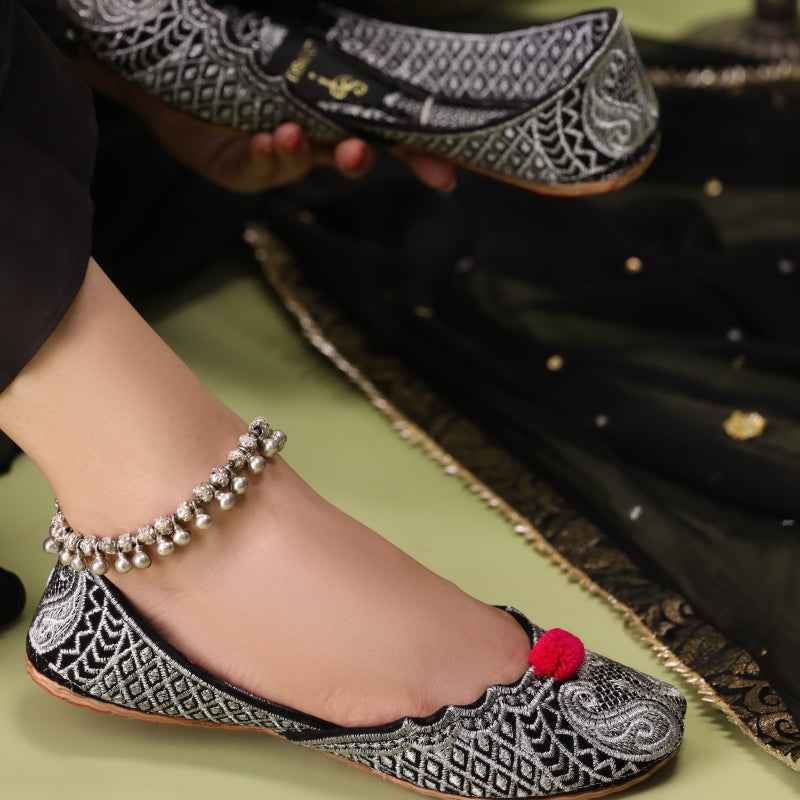 Our Naqsh-e-Chandi khussa showcases intricate metallic-silver thread lacework hand-stitched on a plush black velvet base, framed by matching velvet piping and cushioned with a soft velvet insole for all-day wear. Because each pair is crafted entirely by hand, slight variations in stitch density and pattern alignment ensure your khussas are uniquely yours. Pair them with crisp white linen trousers and sterling-finish jewelry for a fresh daytime look, or let the silver design pop against a deep navy kurta for evening sophistication. To maintain their lustrous shine, gently dust off any debris with a soft, dry cloth and store in a cool, dry place—preferably in a dust bag—away from direct sunlight.