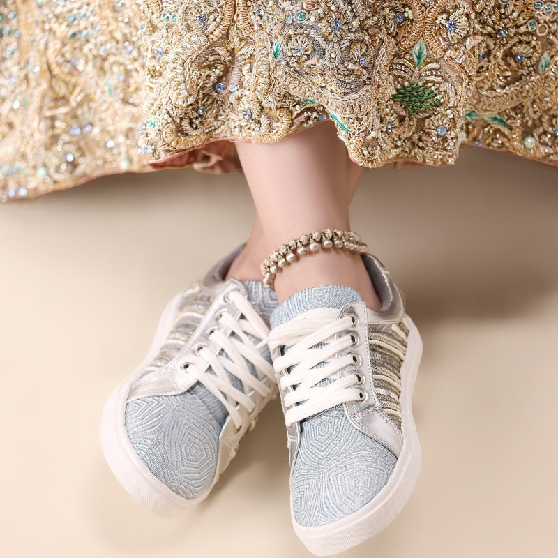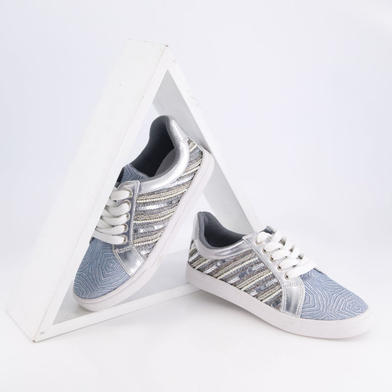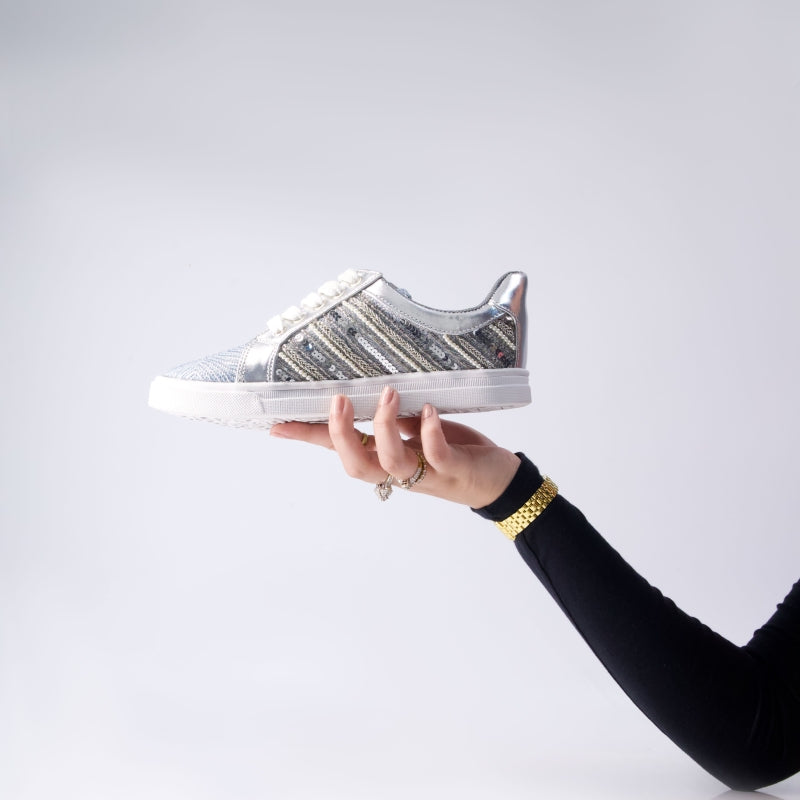 Shimmering metallic silver panels meet rows of sparkling sequins and subtle mesh knit, all atop a supportive, molded-cushion sole—your go-to for eye-catching shine and next-level comfort.