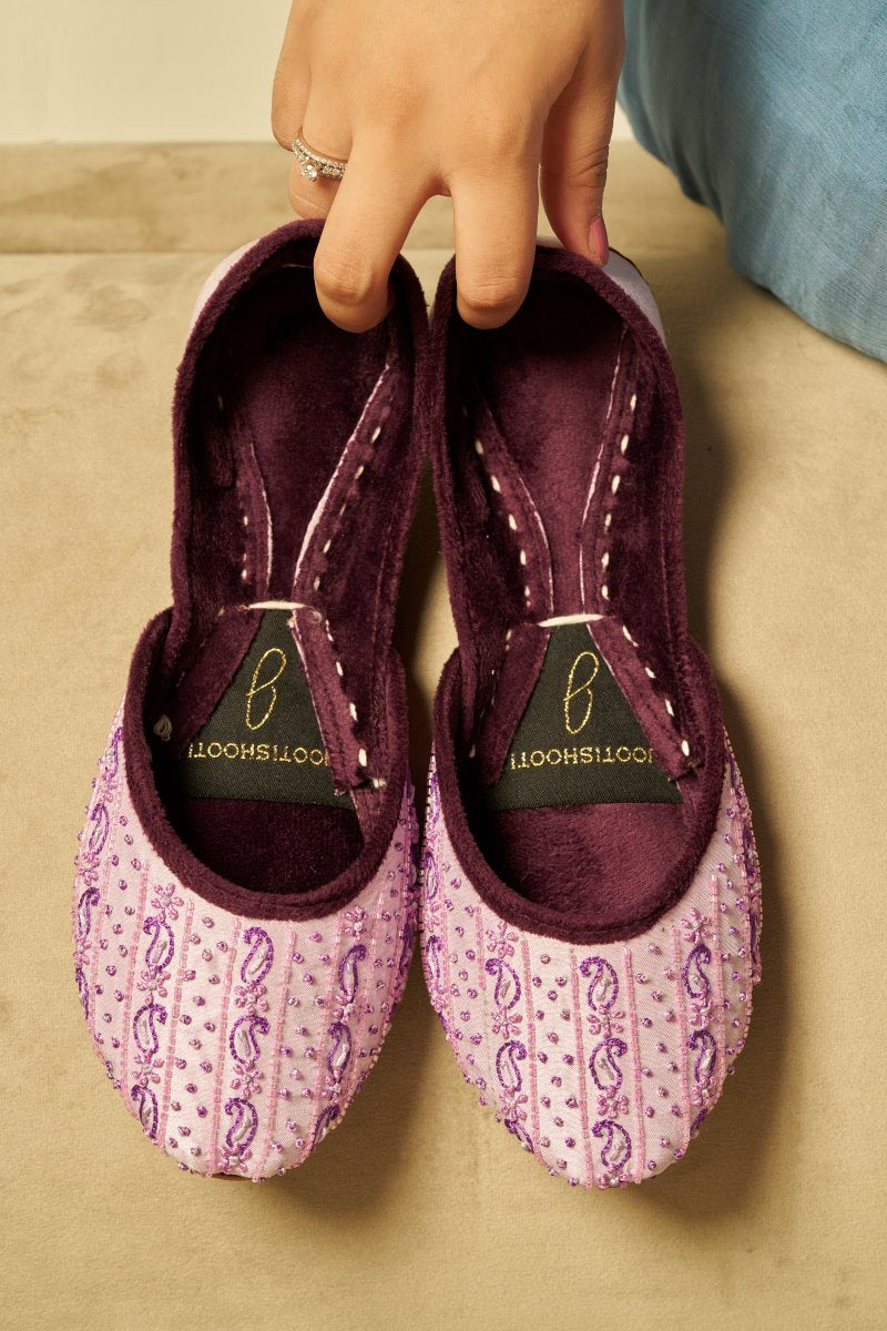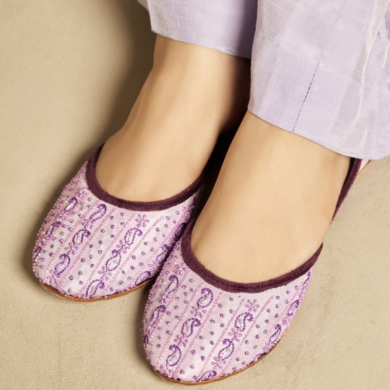 Step into elegance with our exquisite lavender embroidered khussas. These beautifully crafted khussas feature intricate purple beadwork and delicate patterns, making them a perfect blend of tradition and modern style. The soft lavender fabric is complemented by a rich, dark trim, adding a touch of sophistication to any outfit. Designed for comfort and style, these flats are ideal for both casual and formal occasions. Elevate your footwear collection with these unique and stylish embroidered flats.