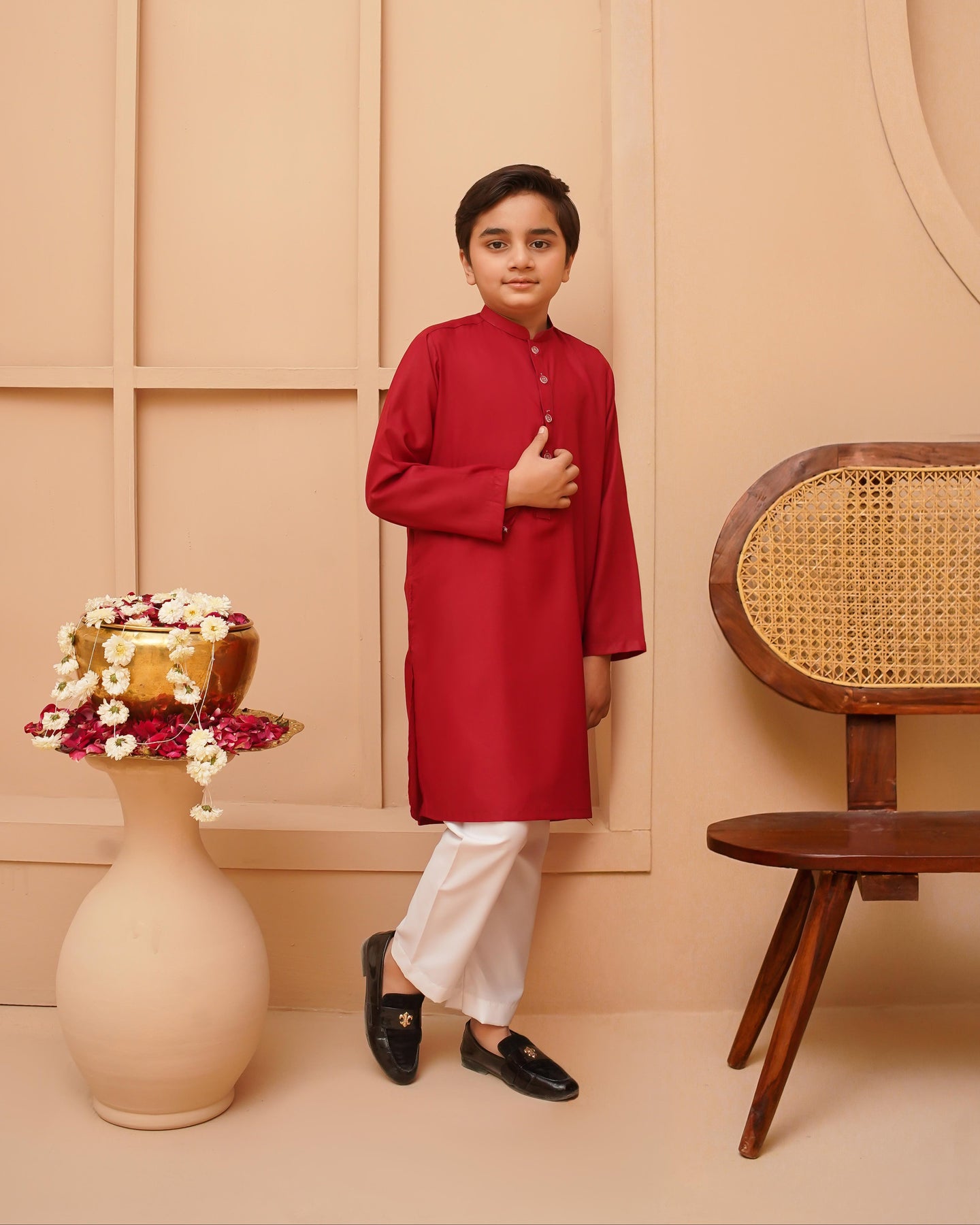 Dress your little prince in this stylish Red Kurta Pajama Set, crafted for both comfort and tradition. The kurta, made from breathable wash-and-wear fabric, ensures a crisp and polished look all day. Paired with a classic white pajama, this ensemble is perfect for festive occasions, weddings, and cultural celebrations.