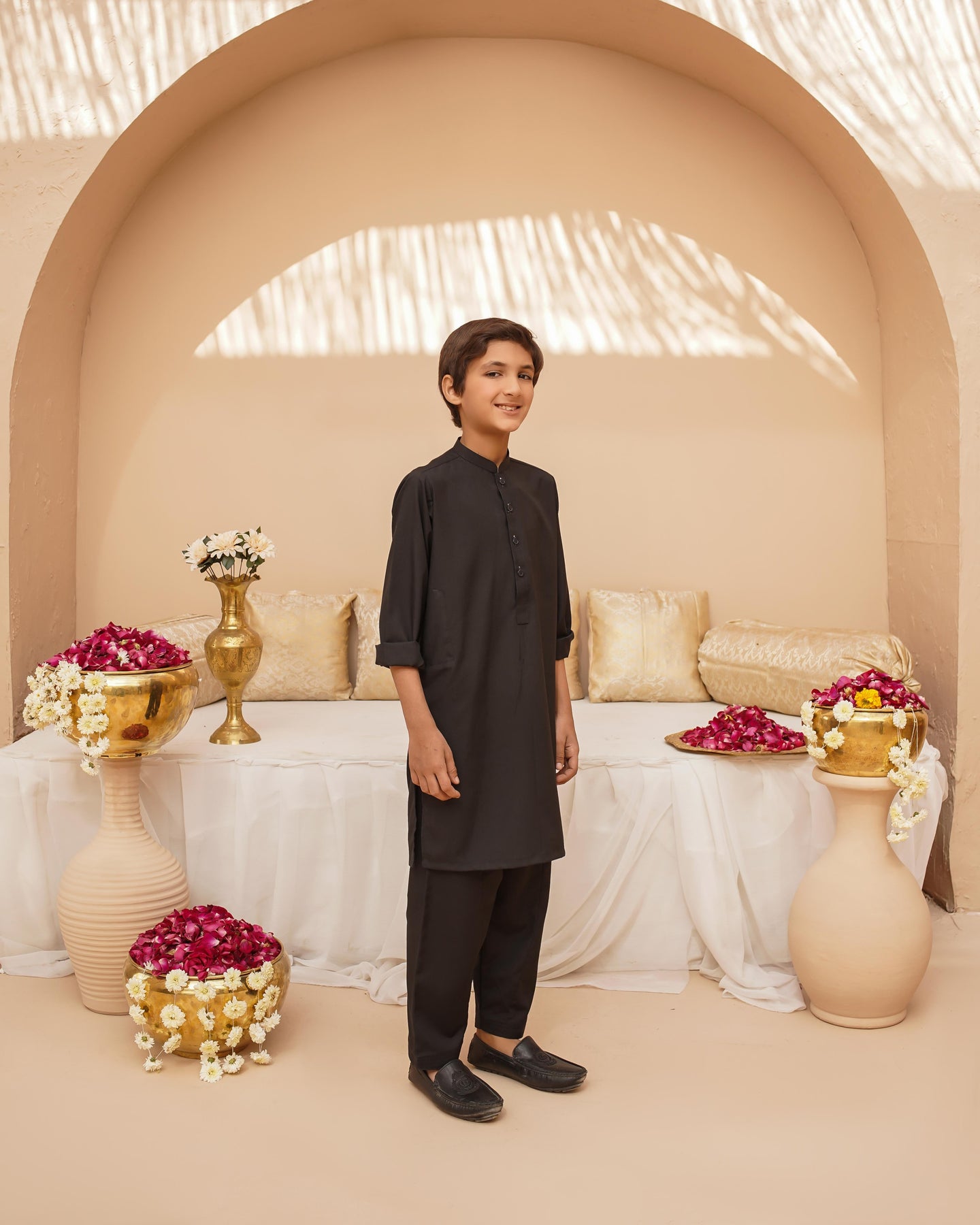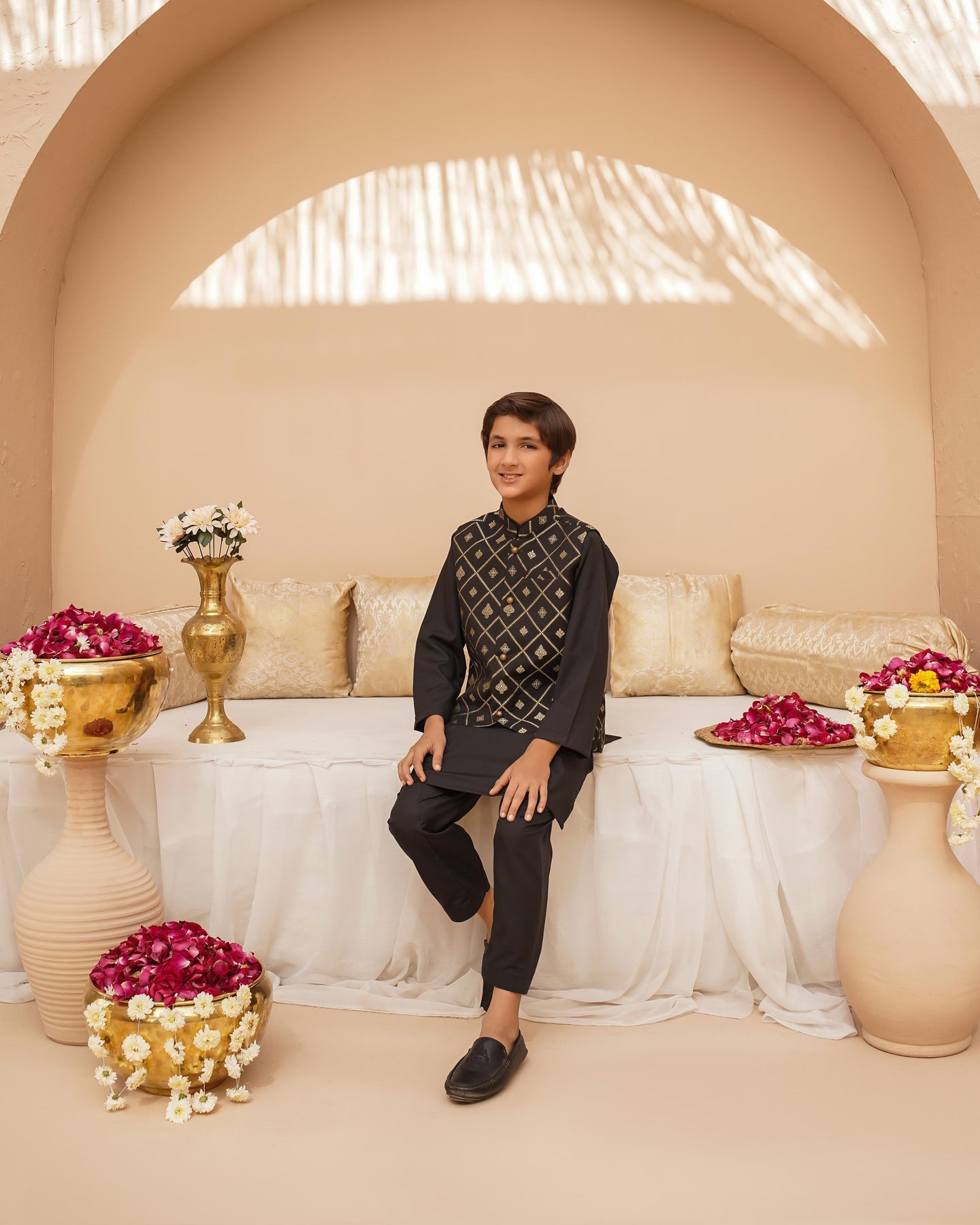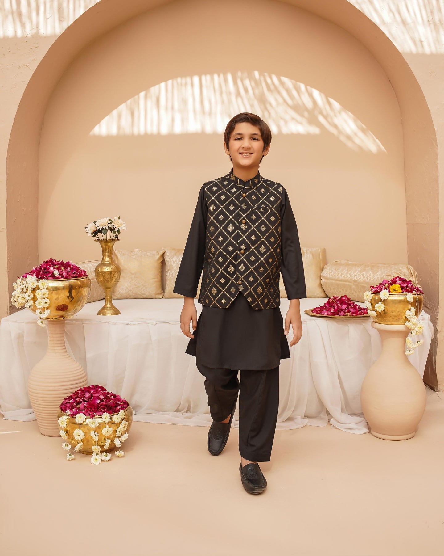 Give your little one a standout look with this black 3-piece set. The printed jacquard waistcoat with gold buttons offers a luxe appeal, perfectly complementing the comfortable wash-and-wear black kurta and pajama. A must-have for festive gatherings and formal events!