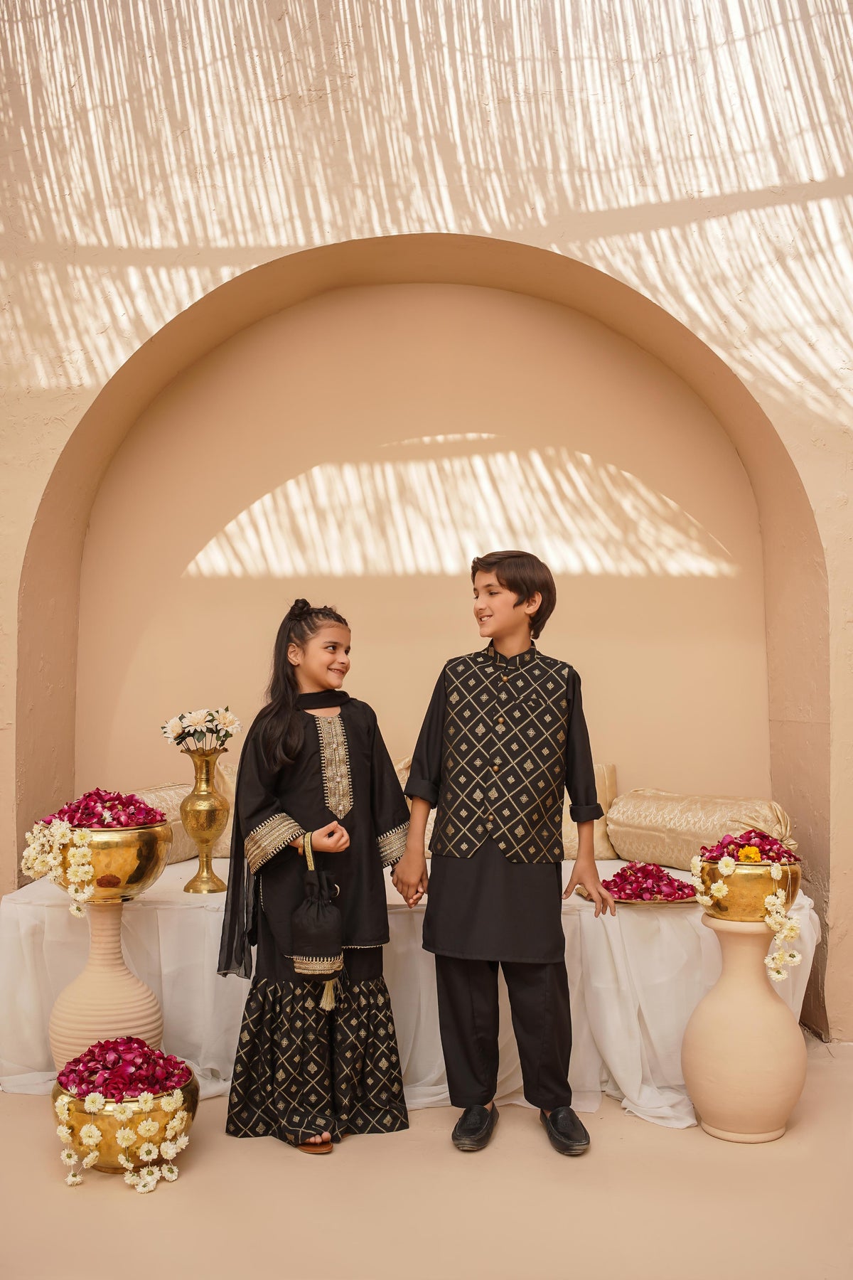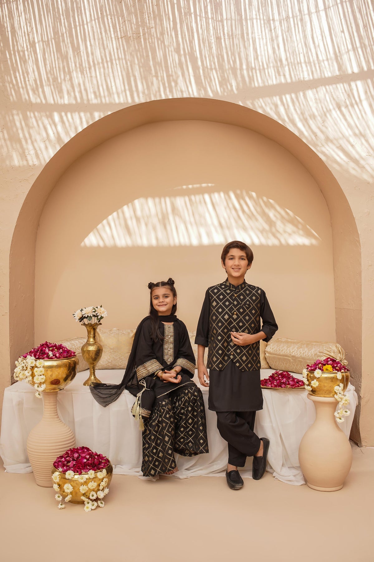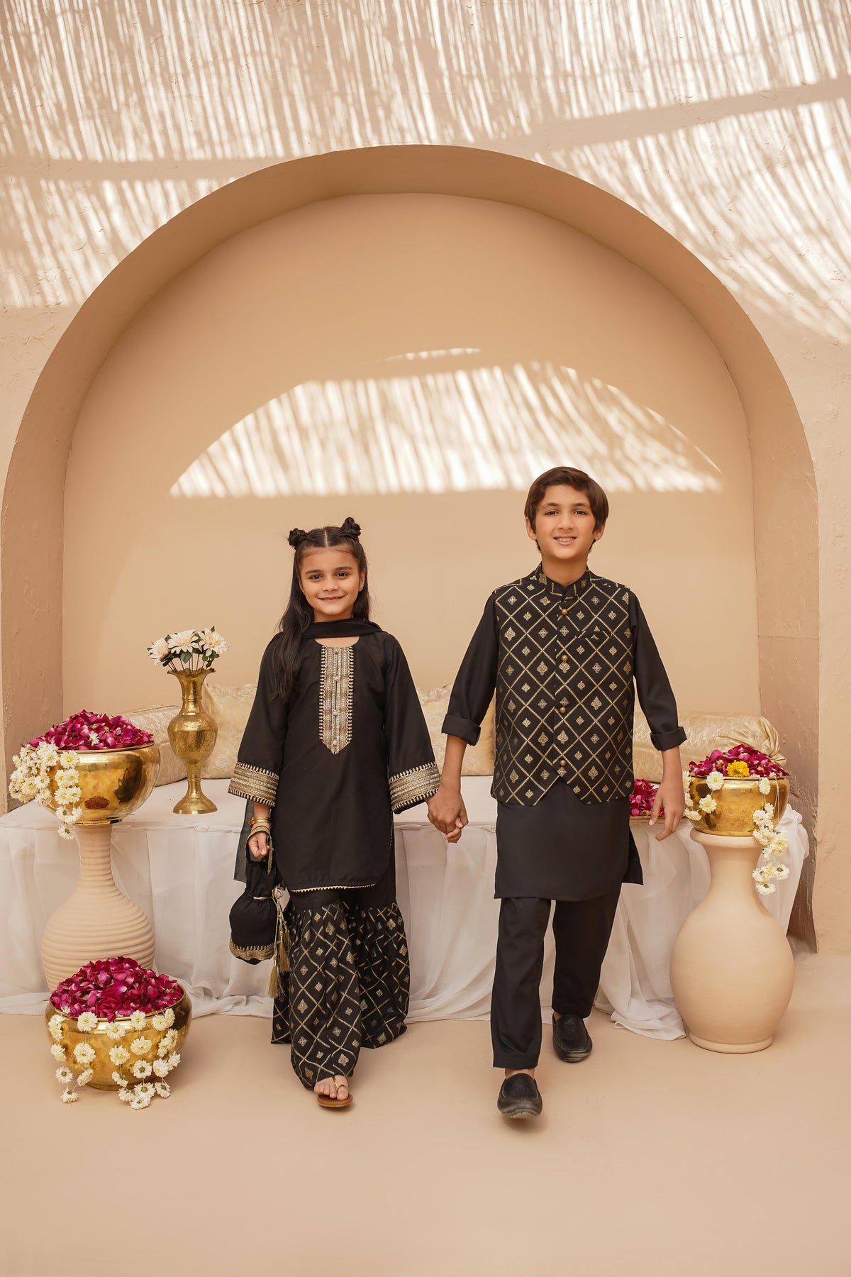 Give your little one a standout look with this black 3-piece set. The printed jacquard waistcoat with gold buttons offers a luxe appeal, perfectly complementing the comfortable wash-and-wear black kurta and pajama. A must-have for festive gatherings and formal events!