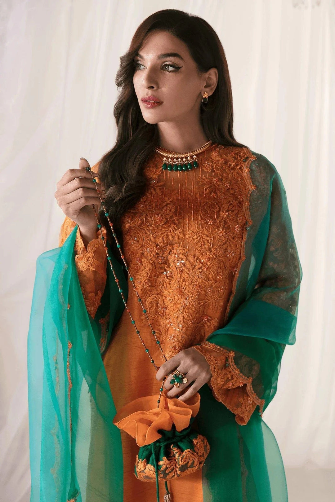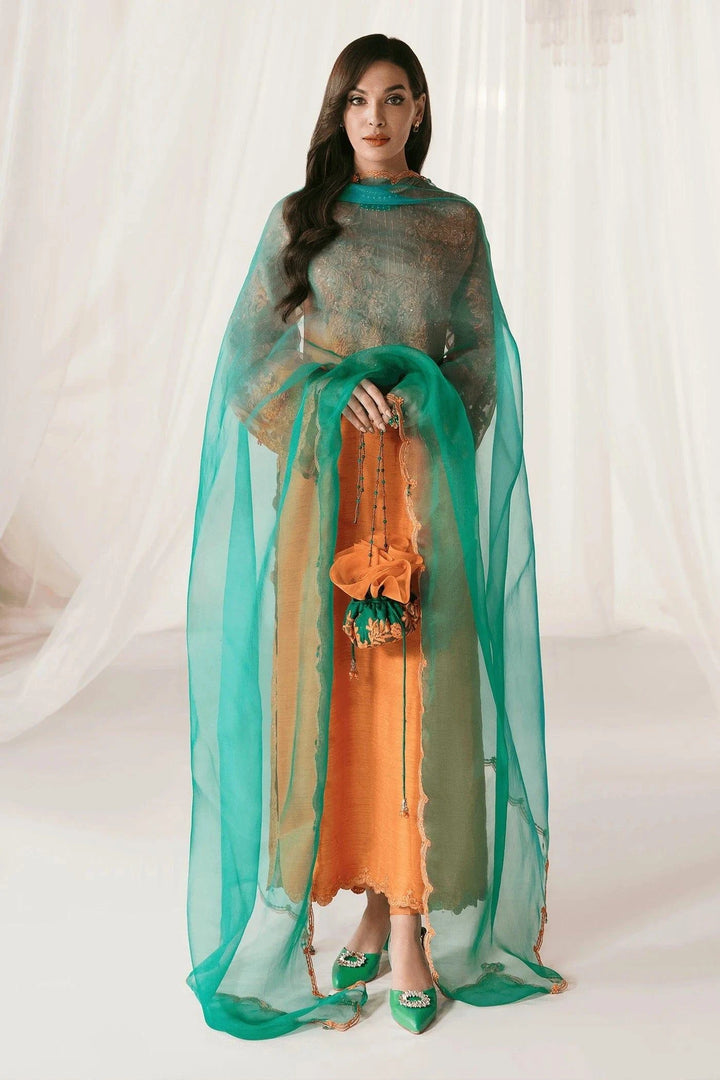 Nilofer Shahid - Korean Raw Silk Heavy Embroidered Shirt & Pants with Pure Organza Dupatta - Majestic Flare - 3 Piece - Studio by TCS