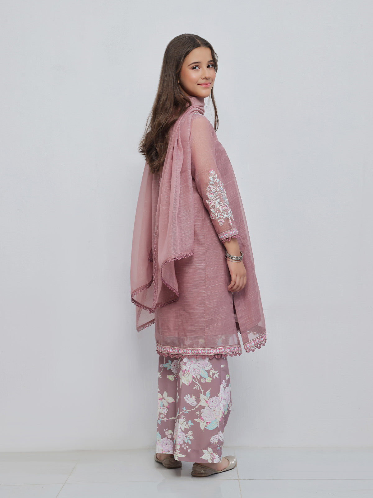 Oaks - Embroidered Slub net polly Suit For Girl - Light Lilac - 3 Piece