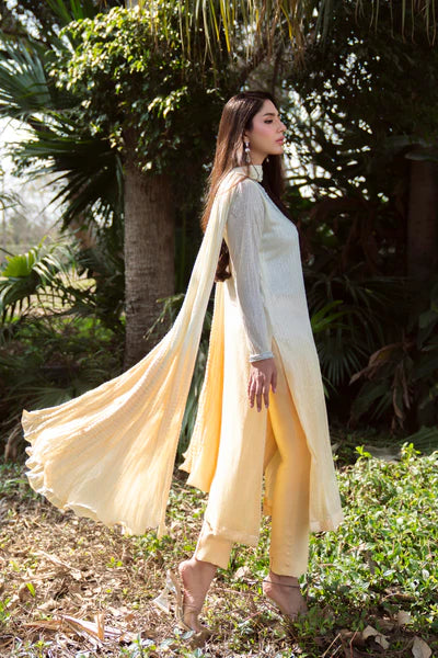 "Composition Tunic:Sequinned mesh net lined with silk Pants: Raw Silk Dupatta :Crushed Silk Dry Clean Only" - ombre buttercream set with hand embellsihed crystal (three piece set) - In a luminous ombre buttercream hue, this graceful ensemble brings understated elegance to every occasion. Cut in a fluid silhouette, it features a sequinned canvas delicate hand embellishment along the neckline and sleeves, and a softly hand pleated dupatta for an ethereal finish. Style it with statement earrings and dewy makeup for daytime festivities or sunset soirées.