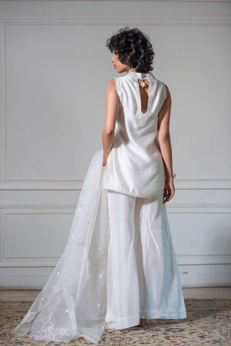 A short angarkha style shirt with Aari work on neckline and small motifs all over. Back has a keyhole motif with embroidery and tassel. Sleeves with embroidery can be added on request. Paired with Dhaka pants. The look is elevated with an Organza dupatta with embroidered pallu. Shirt: Butter Sheesha mat finish Slip/Pants: Korean Silk Dupatta: Organza Color: Ivory Model’s height is 5’5 wearing Small Shirt length 32 Dhaka length 40