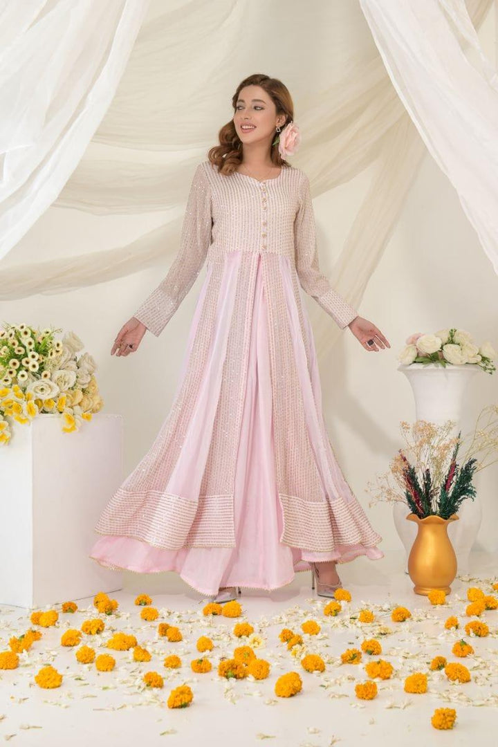 A beautiful front open pink heavy embellished embroidery chiffon with plain net panels. Can be paired with Raw silk lehnga . It becomes the perfect outfit for any occasion.