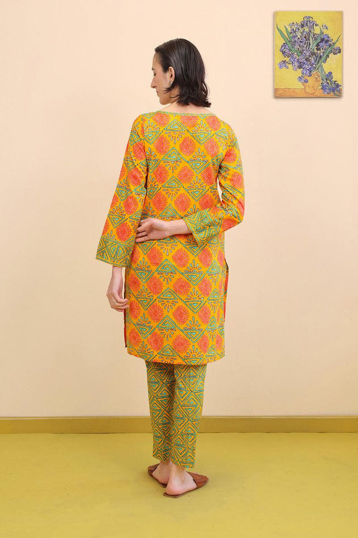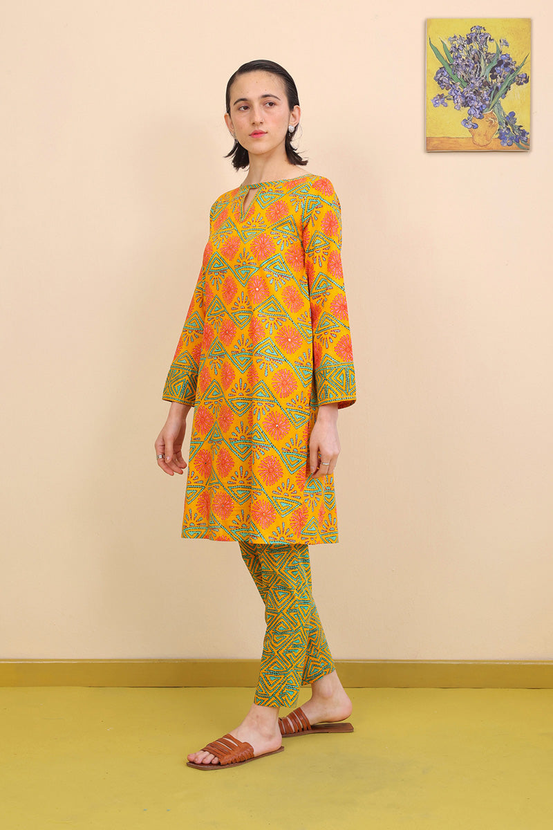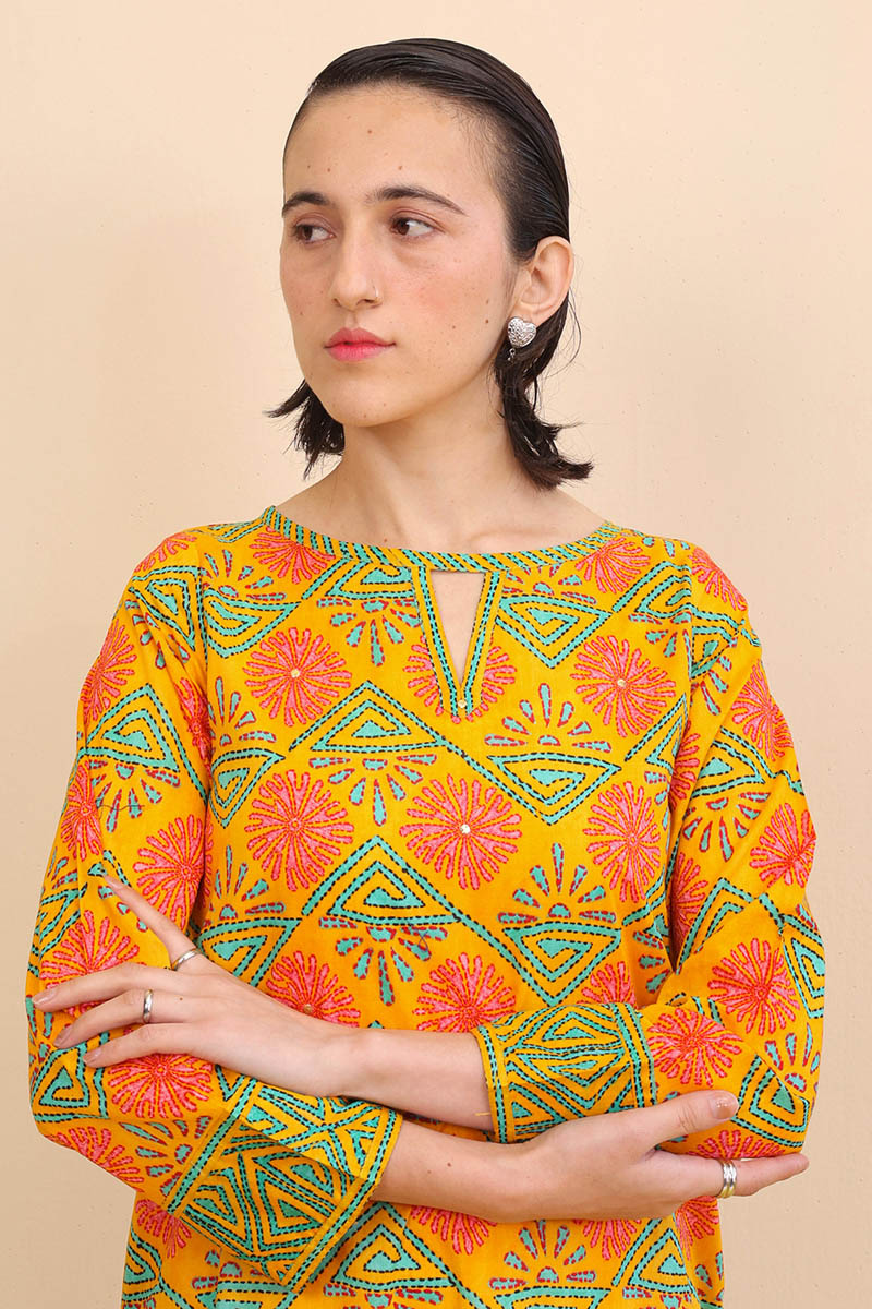 Printed long shirt with boat neck and cutout detail and full sleeves. Paired with contrast print cigarette pants.