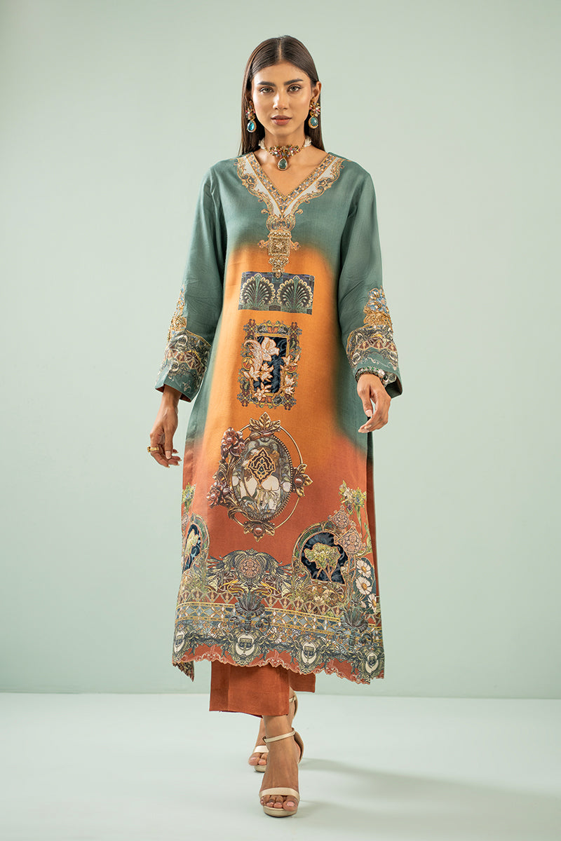 This striking outfit features a beautifully blended emerald-to-rust gradient, creating a warm and regal canvas for its intricate digital artwork. The V-neckline is framed with ornate detailing, while the sleeves are adorned with elaborate baroque-inspired motifs that elevate the elegance of the silhouette. The front of the kurta showcases grand, tapestry-like patterns, including architectural frames, floral scrolls, and ornate emblems, all meticulously illustrated for a luxurious finish. The hem is richly decorated with detailed borders, adding depth and sophistication. Paired with rust-toned trousers, this ensemble exudes a refined, artistic charm, perfect for festive gatherings, statement occasions, or upscale daywear kitty parties.