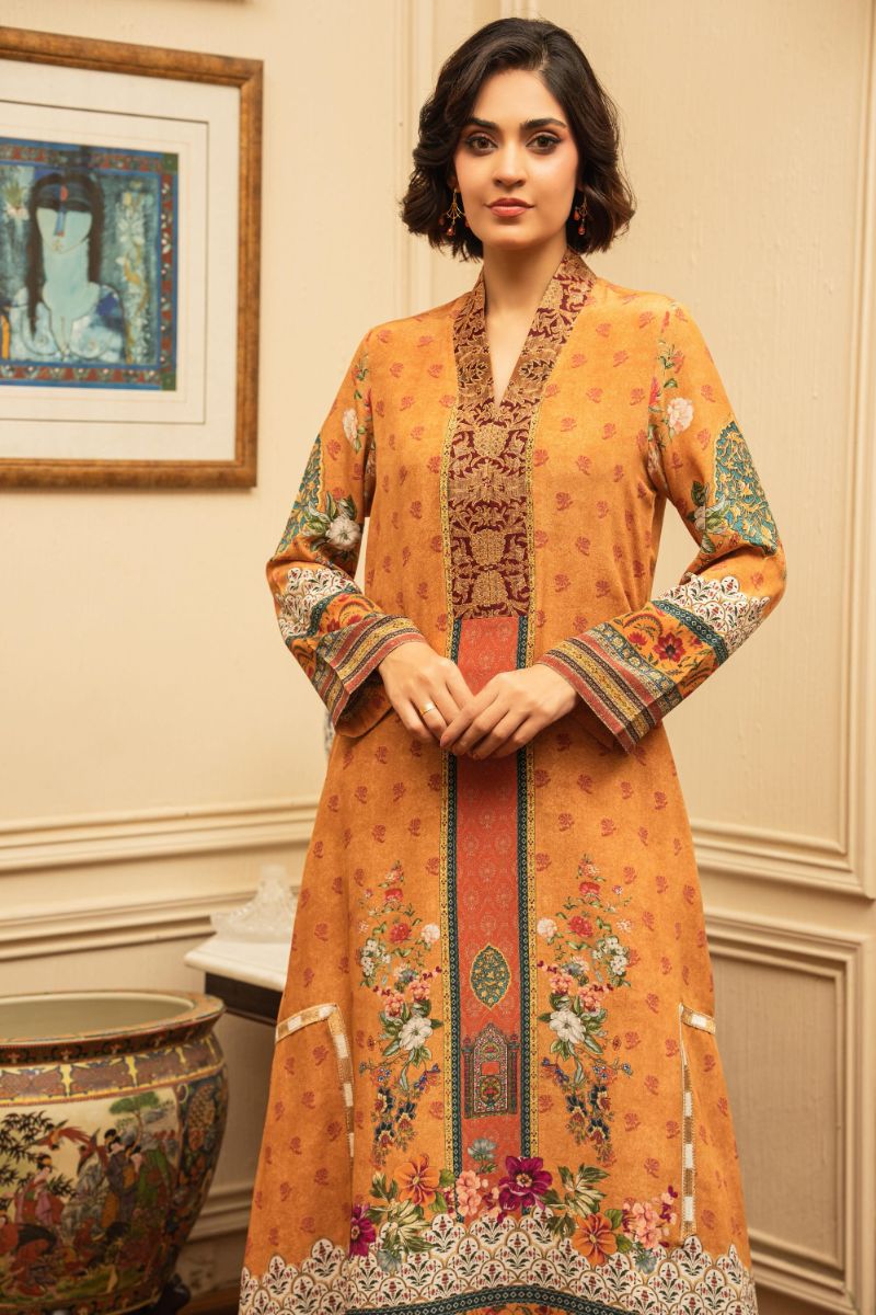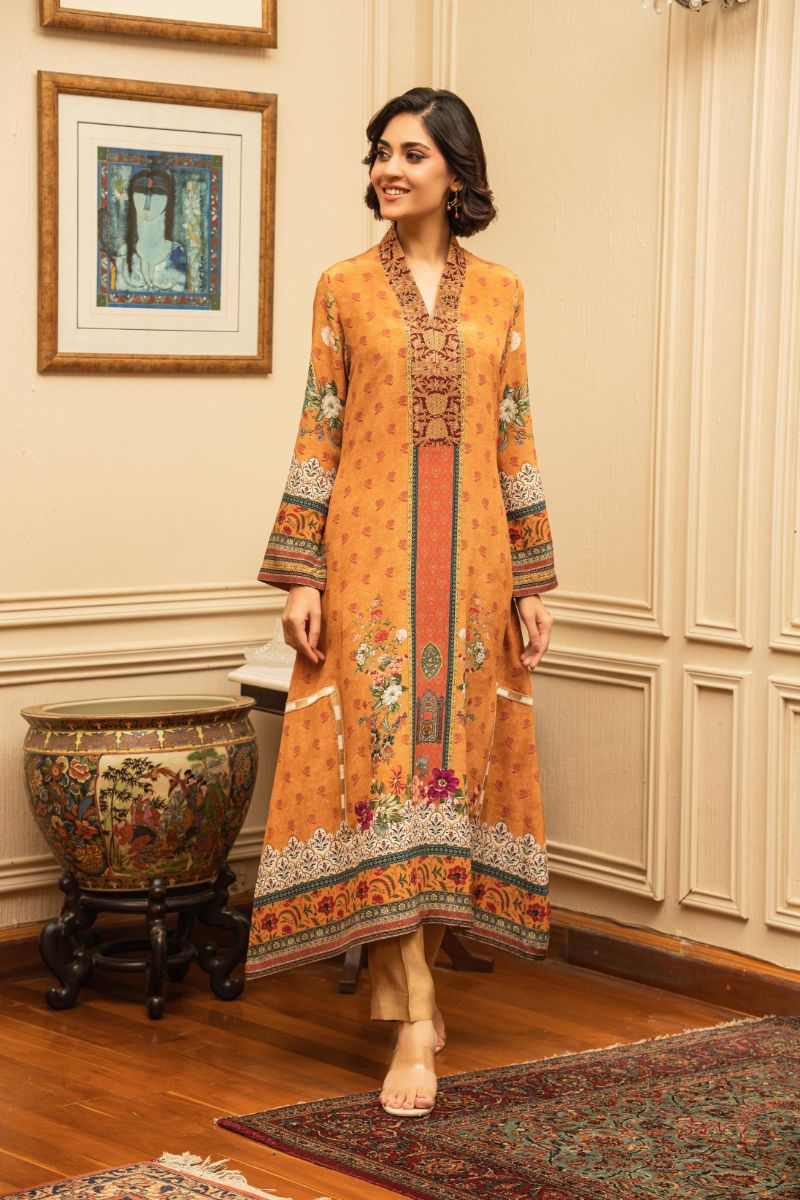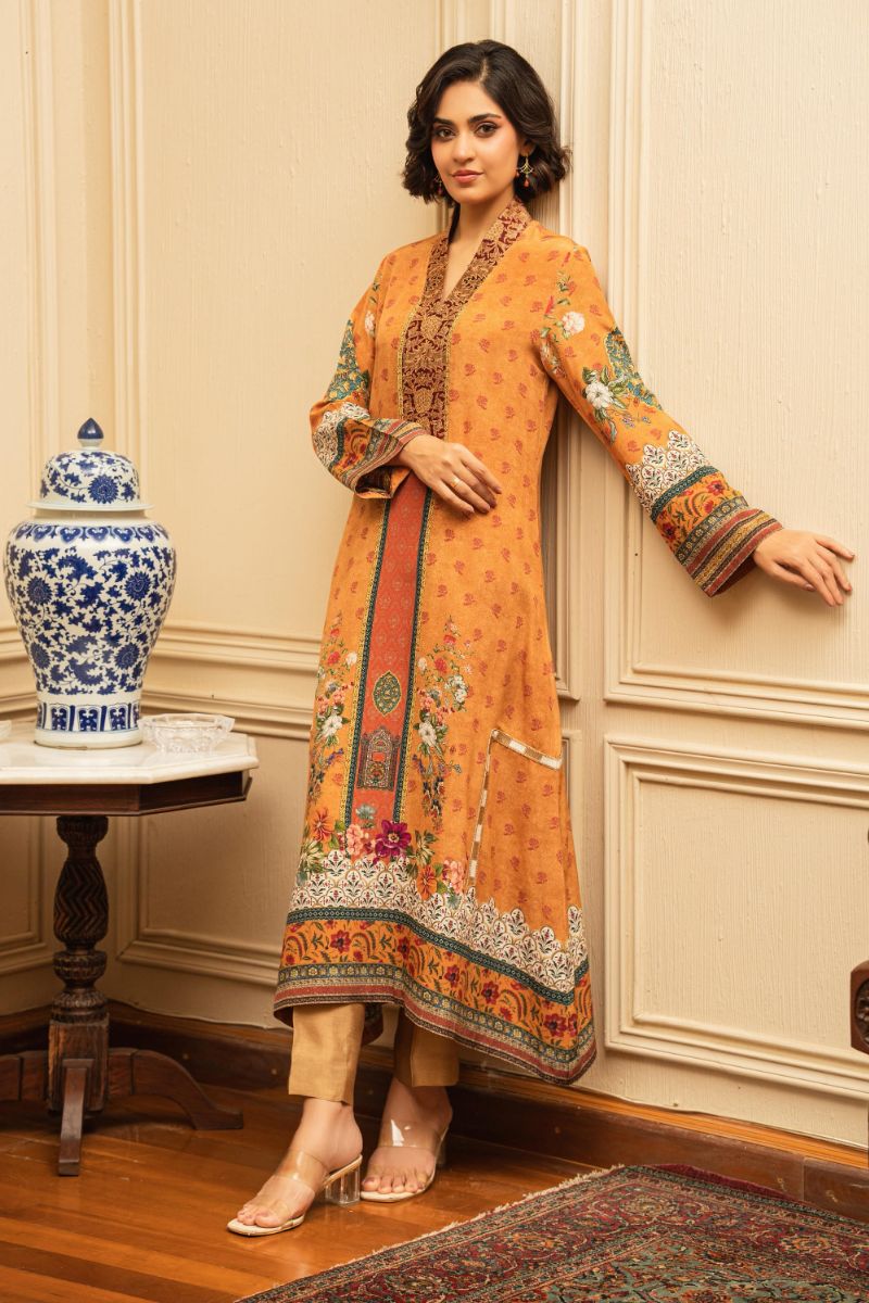 A statement piece from Shamaeel, this long, A-line shirt is rendered in a warm orange hue and digitally printed floral patterns. The neckline boasts luxurious outlined in gold with ethnic accents, while the sleeves and hem are highlighted by elaborate print borders in contrasting tones. The piece is further enhanced with half inch embroidered border on the sides of the slit, comes with the pant, making it a perfect blend of traditional artistry and modern tailoring. Ideal for festive occasions and cultural gatherings. Fabric - shirt: Crepe Fabric - pant: Khadi silk