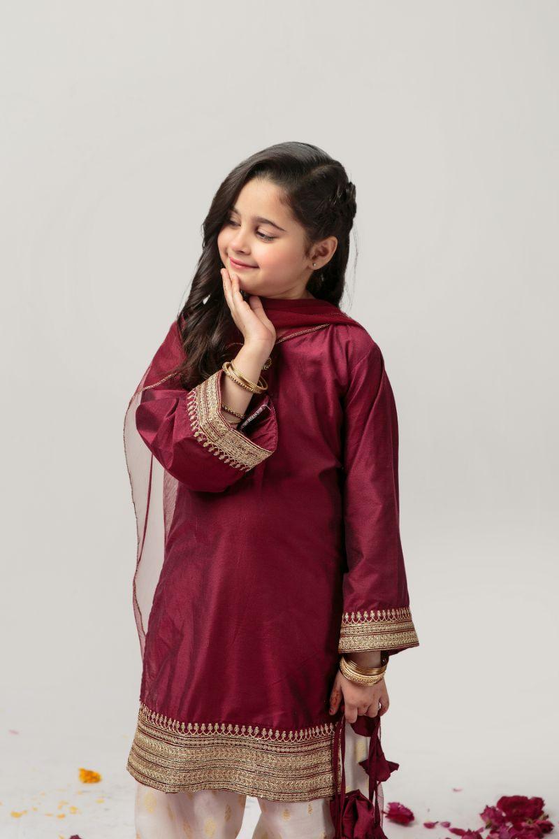 3-piece burgundy maroon cotton silk shirt with intricate zari and sequence work,paired with white jacquard shalwar and dupatta