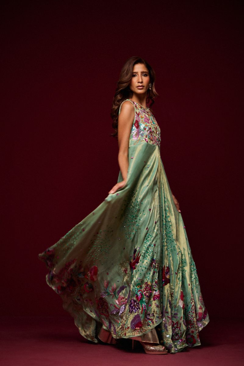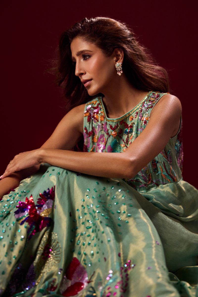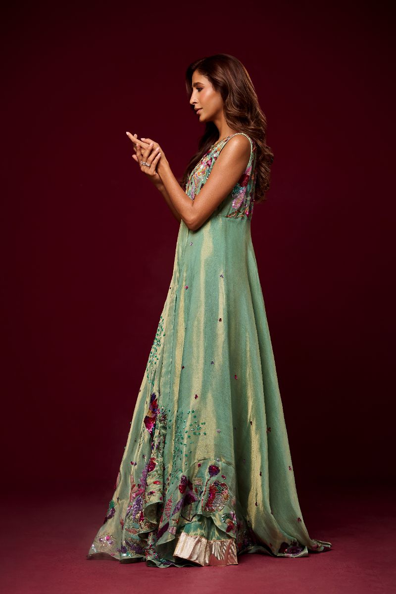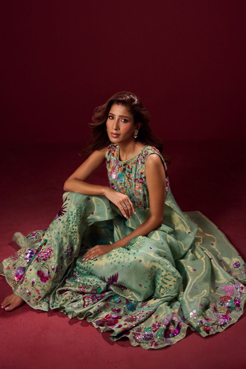 This timeless ensemble begins with a handwoven jamawar shirt, its bold gold patterns exuding regal elegance and old-world grandeur. Draped with a striking doshala, one side in rich rani pink intricately hand-embroidered with a captivating madhubani fish motif, further adorned with sitara and zardozi that shimmer like jewels in motion while the other side unveils pure silk in vibrant orange and red, block-print. Paired alongside is a vibrant hot pink gharara, delicately embroidered all over and finished with gota, adding a festive glow and graceful movement. Together, the pieces weave a story of heritage, artistry, and celebration in every detail.