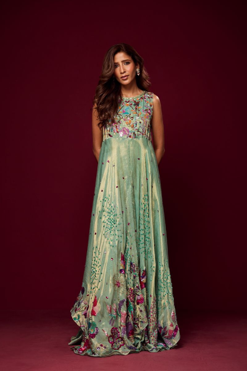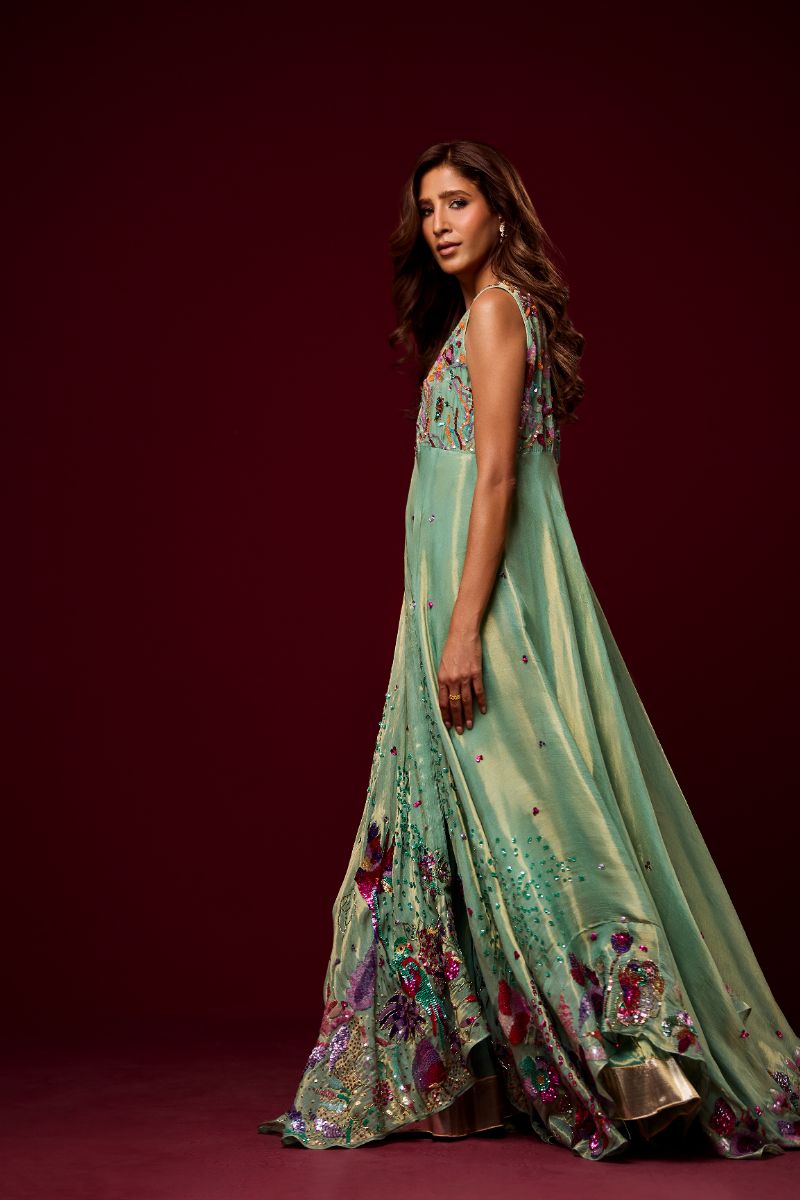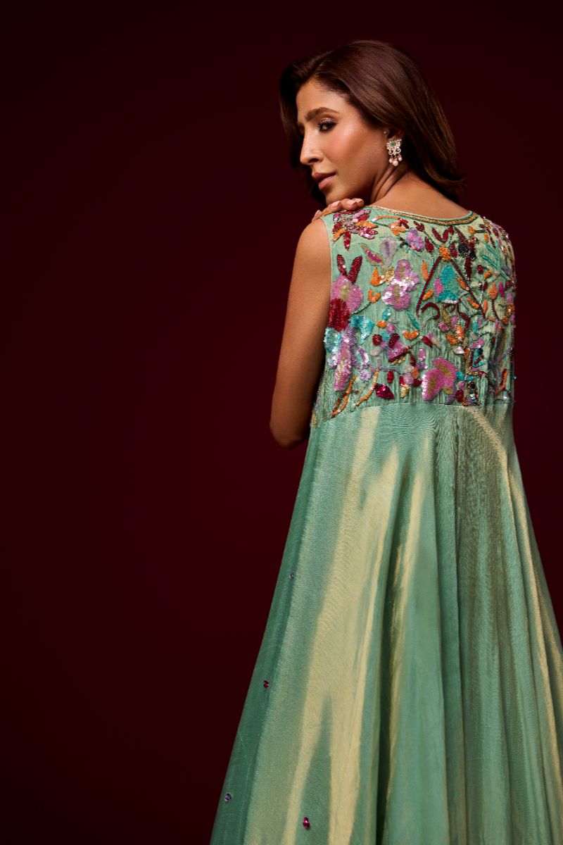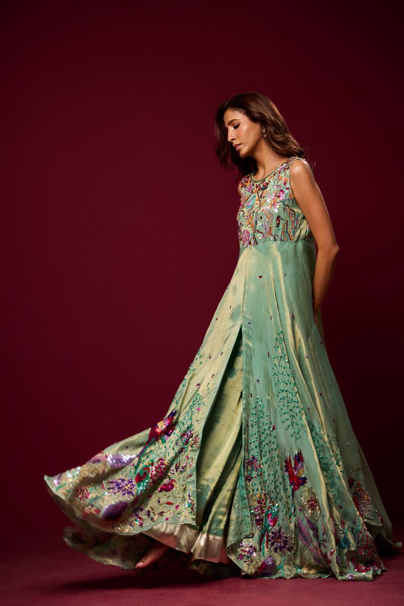 This timeless ensemble begins with a handwoven jamawar shirt, its bold gold patterns exuding regal elegance and old-world grandeur. Draped with a striking doshala, one side in rich rani pink intricately hand-embroidered with a captivating madhubani fish motif, further adorned with sitara and zardozi that shimmer like jewels in motion while the other side unveils pure silk in vibrant orange and red, block-print. Paired alongside is a vibrant hot pink gharara, delicately embroidered all over and finished with gota, adding a festive glow and graceful movement. Together, the pieces weave a story of heritage, artistry, and celebration in every detail.