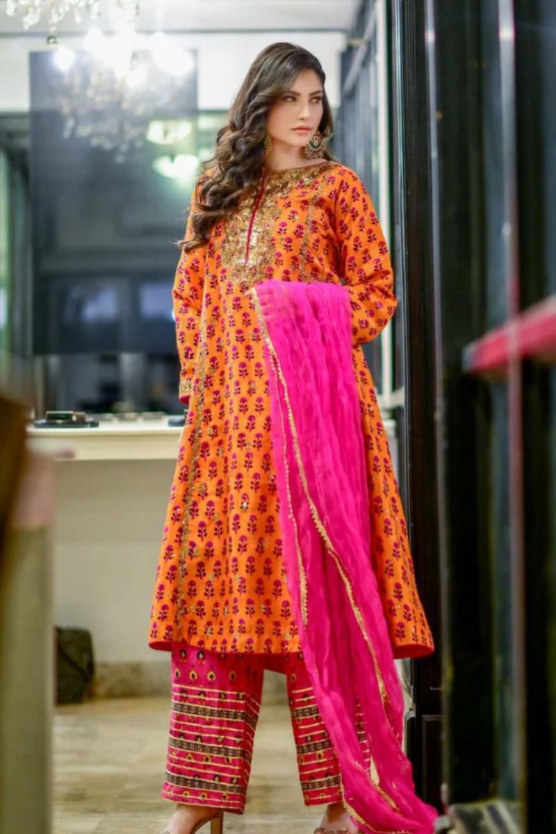 Pinktree - Neelum Munir Outfit - Orange & Hot Pink - Silk - 3 Piece