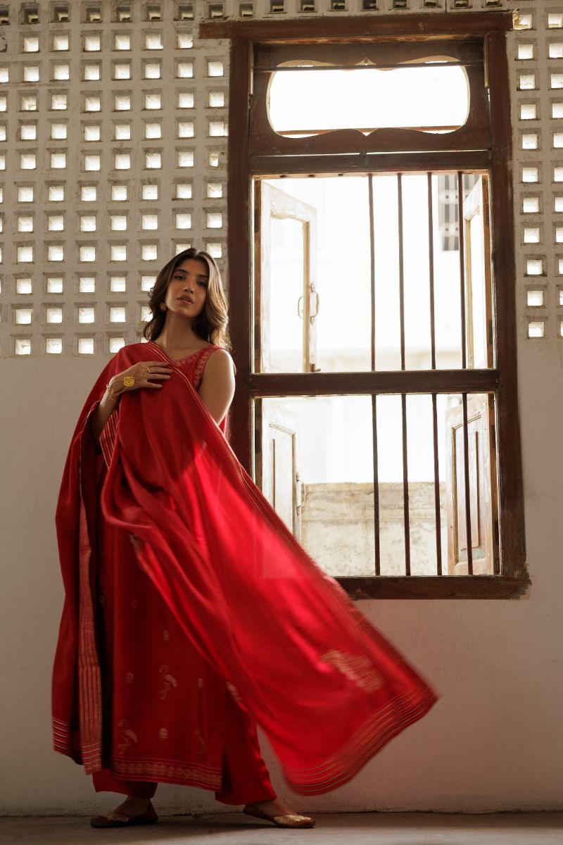 Elegant 3-piece pure silk ensemble featuring a long, sleeveless straight-cut shirt in a rich red base, adorned with intricate block prints in gold and rani pink. Paired with a classic red izaar for a timeless silhouette. Completing the look is a beautifully coordinated red dupatta, detailed with matching pink and gold block prints, adding a graceful touch to this traditional yet stylish outfit.