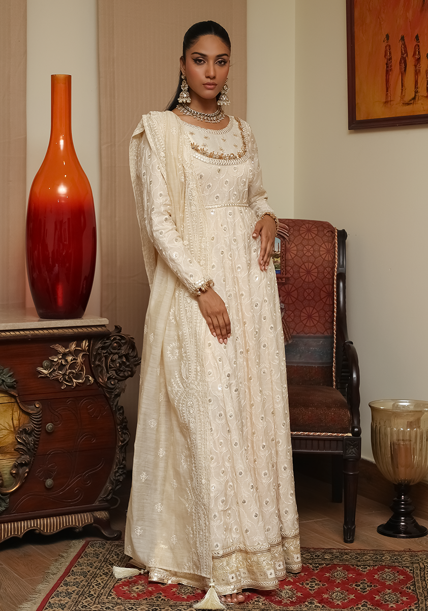 Maria Osama Khan - Nisbat Baige Organza / Raw Silk Lehnga Suit For Women - 4 Piece