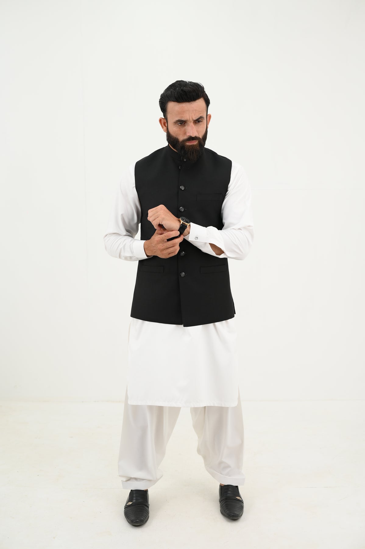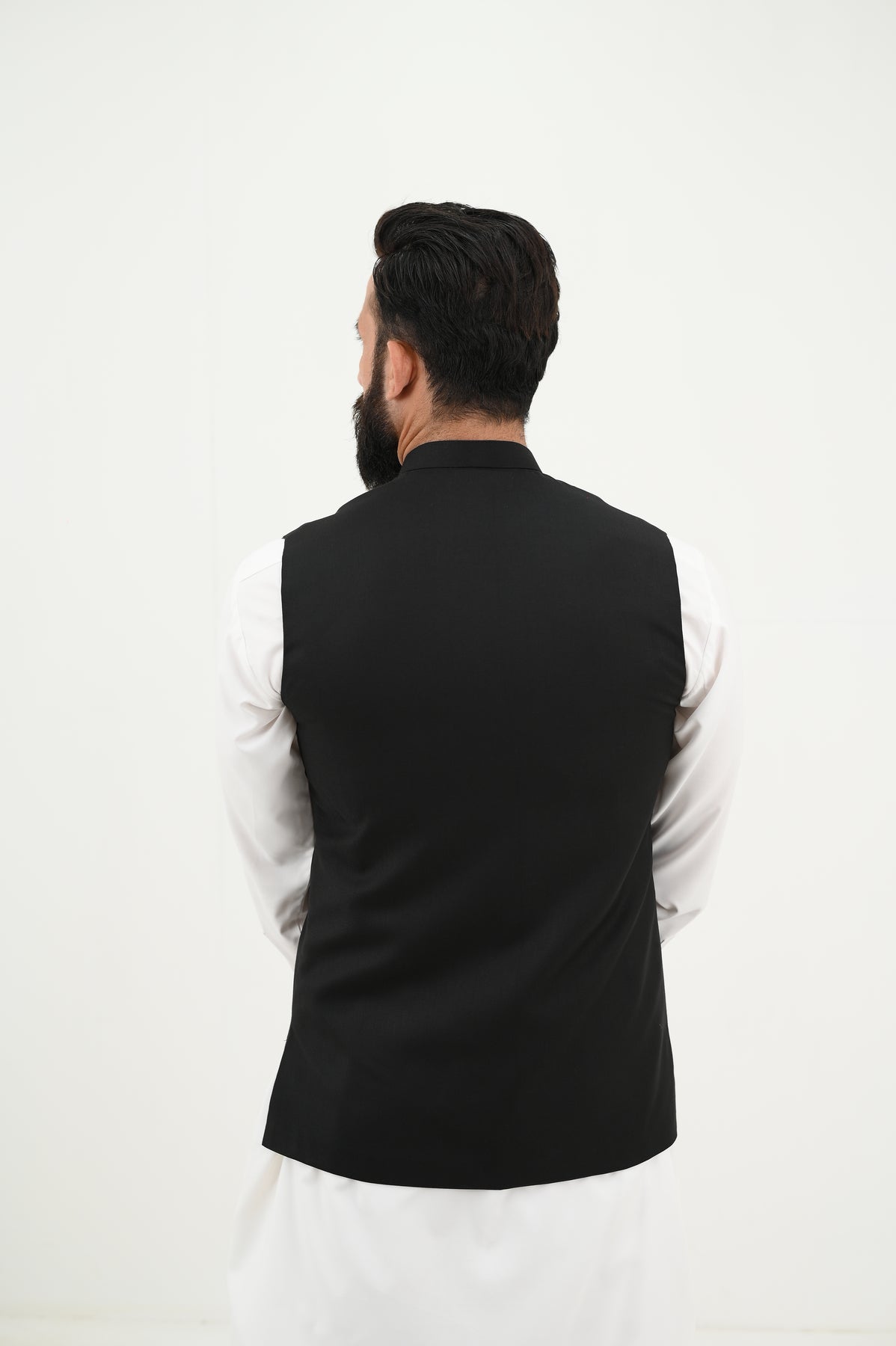 This is a sleek black waistcoat paired with a white kurta shalwar, presenting a refined and commanding look. Unlike the previous black waistcoat, this design is cleaner and more modern, featuring straight flapless pockets, a streamlined cut, and minimal detailing, which gives it a more formal and polished appearance.