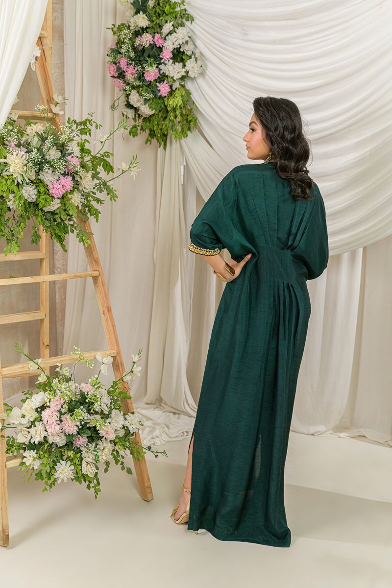 Verde is a rich emerald green kaftan crafted in luxurious silk and finished with handwork. The deep V-neckline and wide sleeves are framed with golden and antique handwork, creating a look that feels regal yet easy to wear.