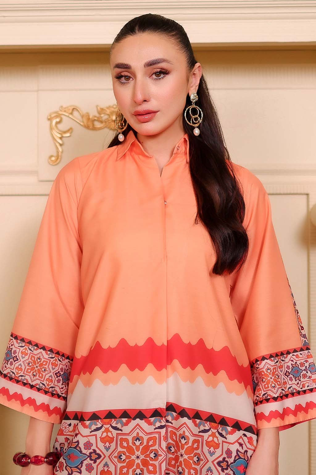 The Batik 2-Piece Coord Set in a soft peach batik print brings artisanal charm to everyday wear. Tailored from breathable Premium Lawn, this set blends effortless comfort with timeless elegance. The top features a classic button-down front with a two-piece collar, full-length sleeves with cuff detailing, and a structured yoke with a box pleat at the back for added ease. A straight hem completes the polished look.